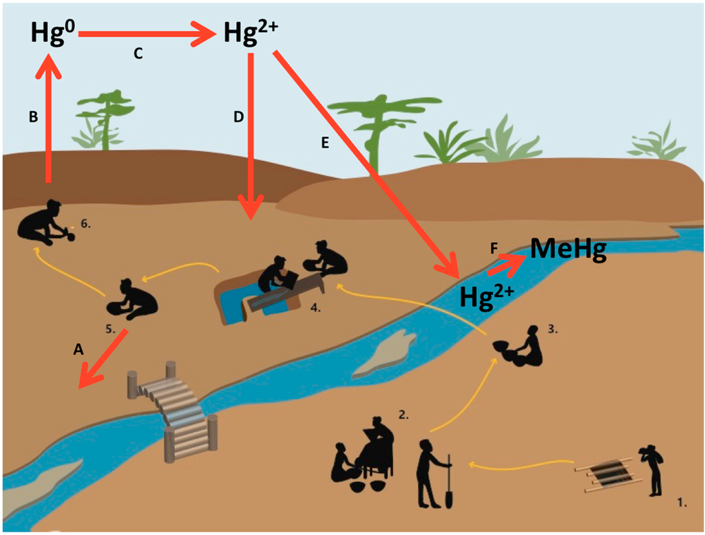 Mercury (Hg) cycle in a typical artisanal and small-scale gold mining (ASGM) process. Numbers represent key steps in the ASGM process: 1—excavation, 2—crushing and grinding, 3—sifting/shanking, 4—washing/sluicing, 5—amalgamation, and 6—burning. Letters represent key steps in the mercury cycle: A—residual mercury from amalgamation may be discarded in local soil and water, B—volatilization of elemental mercury into the atmosphere, C—oxidation of elemental mercury, D—deposition onto local terrestrial systems, E—deposition onto local aquatic systems, F—methylation of inorganic mercury to methylmercury.