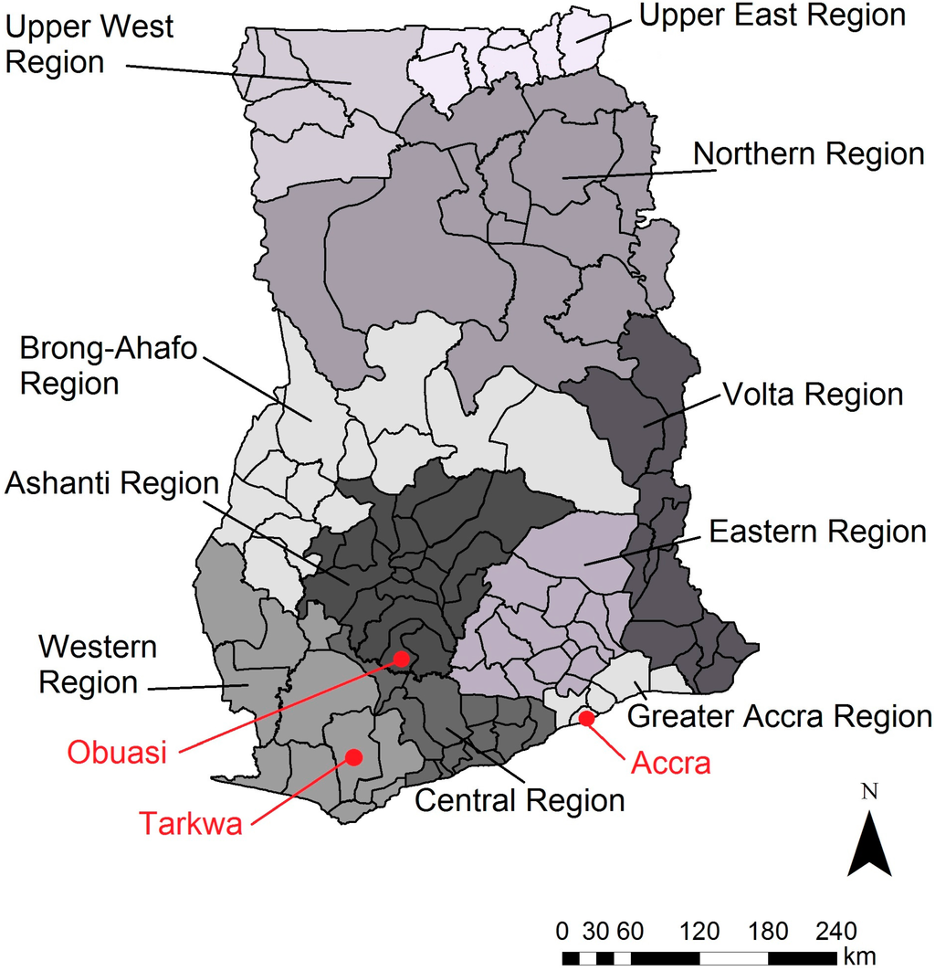 Regional map of Ghana. Key mining areas (Obuasi, Tarkwa) and the capital (Accra) are indicated.