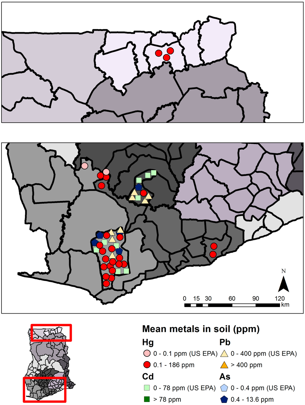 Metals in soil samples in southwest (bottom panel) and northeast (upper panel) Ghana. Each symbol represents the mean metals value (µg/g, ppm) from a single study in that region, and for illustrative convenience the symbols are scattered randomly within the district where the sampling took place. Political regions are distinguished by different shades of grey. Mean total mercury (Hg), lead (Pb), cadmium (Cd), or arsenic (As) above or below guidelines are indicated.