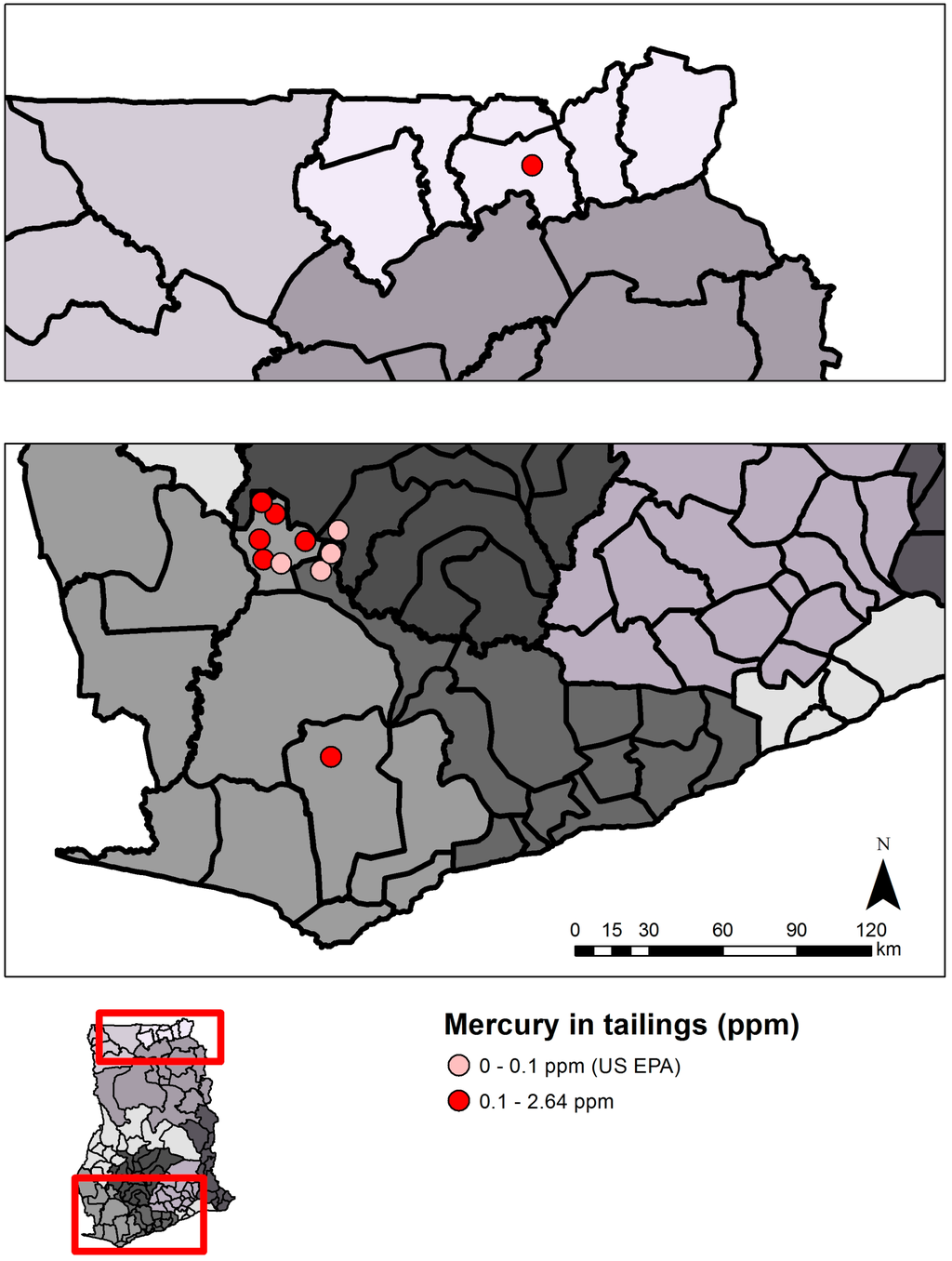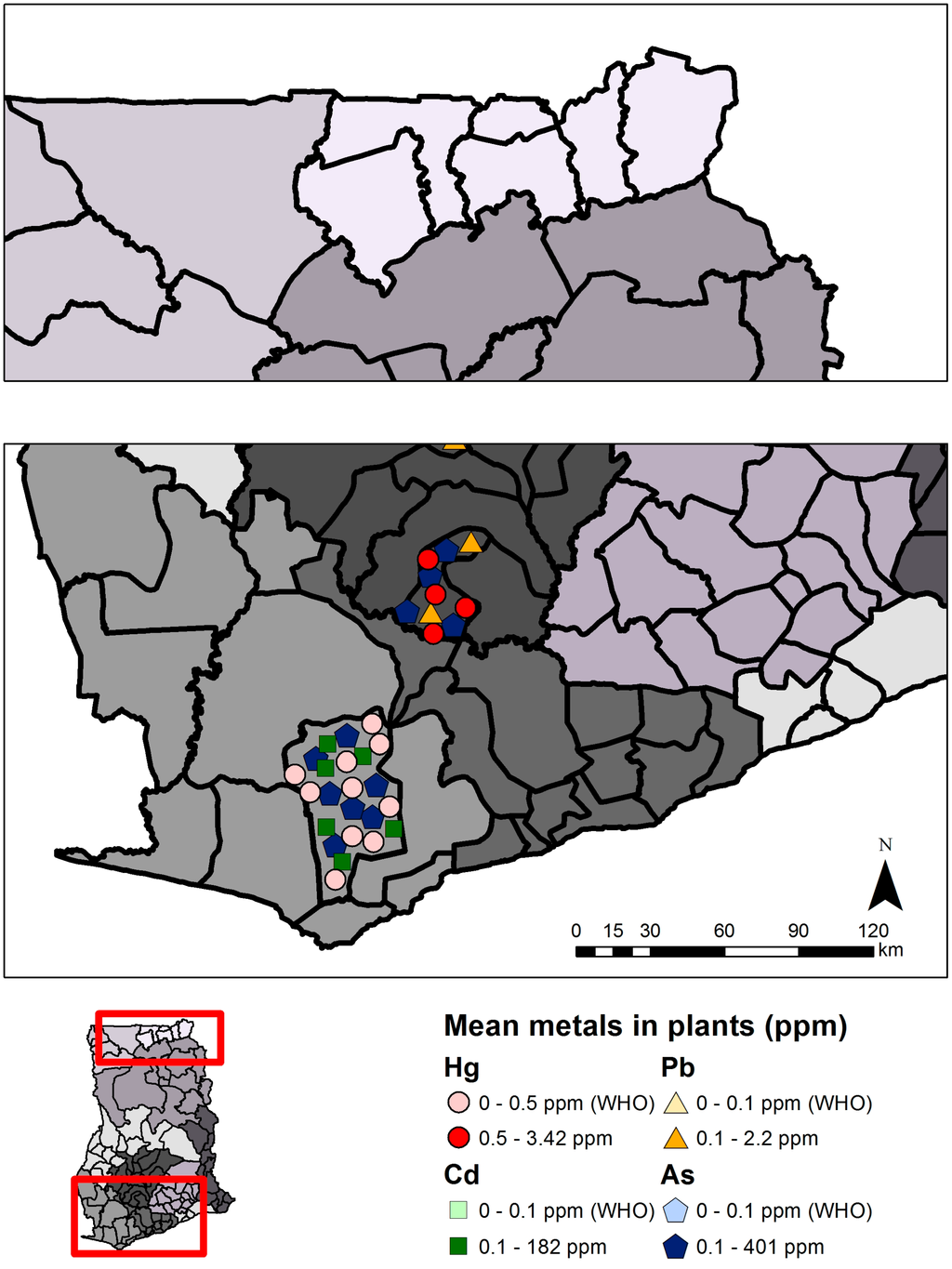 Metals in edible plant parts in southwest Ghana (bottom panel). Each symbol represents the mean metals value (µg/g or ppm) from a single study in that region, and for illustrative convenience the symbols are scattered randomly within the district where the sampling took place. Political regions are distinguished by different shades of grey. Mean total mercury (Hg), lead (Pb), cadmium (Cd), or arsenic (As) above or below guidelines are indicated. Plants sampled include cassava (Manihot esculenta), cocoyam (Xanthosoma sagittifolium), water cocoyam (Colocasia esculenta), plantain (Musa paradisiacal), and water fern (Ceratopteris cornuta) grown in or around current or former ASGM sites.