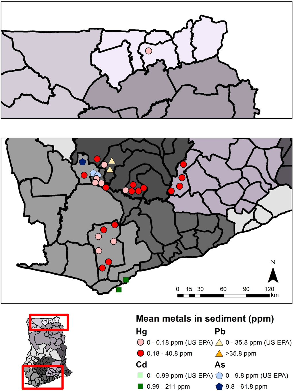 Metals in sediment samples in southwest (bottom panel) and northeast (upper panel) Ghana. Each symbol represents the mean metals value (µg/g or ppm) from a single study in that region, and for illustrative convenience the symbols are scattered randomly within the district where the sampling took place. Political regions are distinguished by different shades of grey. Mean total mercury (Hg), lead (Pb), cadmium (Cd), or arsenic (As) above or below guidelines are indicated.