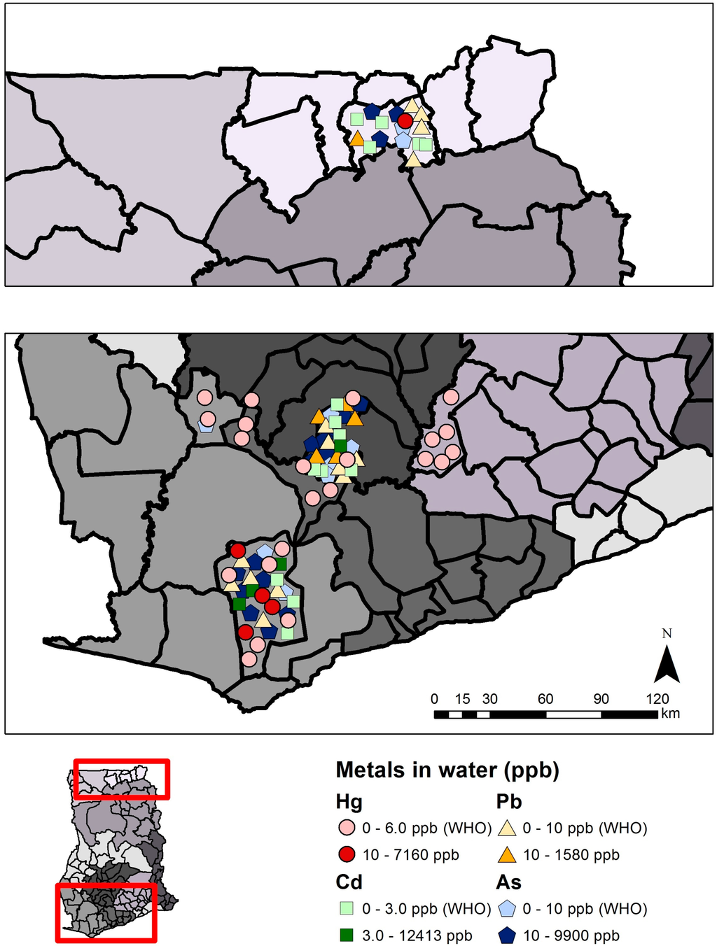 Metals in surface/groundwater samples in southwest (bottom panel) and northeast (upper panel) Ghana. Each symbol represents the mean metals value (µg/L or ppb) from a single study in that region, and for illustrative convenience the symbols are scattered randomly within the district where the sampling took place. Political regions are distinguished by different shades of grey. Mean total mercury (Hg), lead (Pb), cadmium (Cd), or arsenic (As) above or below guidelines are indicated.