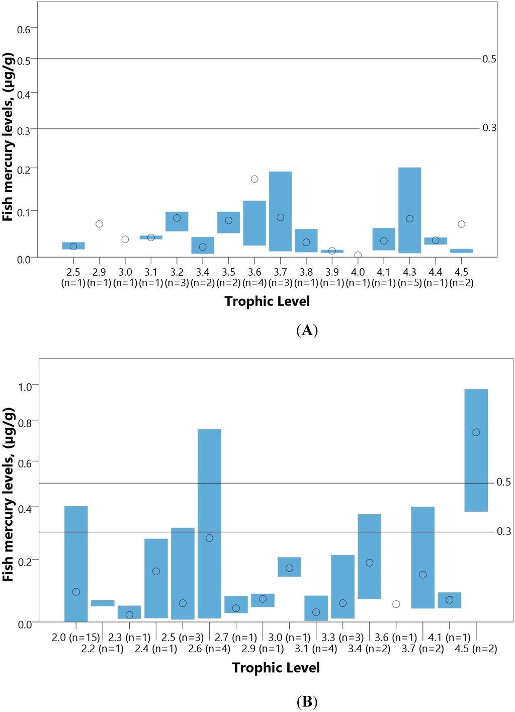 Mercury in marine (A) and freshwater (B) fish in Ghana. Bars represent range and dots represent means for fish at each trophic level (n = number of studies) across Ghana. For values below detection limit, standard protocol of dividing the detection limit by was followed. Where minimum and maximum measurements were not available for a study, the mean value is included in the overall mean for the trophic level, but no minimum or maximum was included in calculations. WHO/FAO (0.5 µg/g) and U.S. EPA (0.3 µg/g) guideline values are indicated as horizontal lines [37,38]. All studies except for two sampled in districts or regions with ASGM, but only one explicitly sampled at or close to an ASGM site.