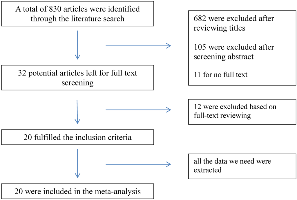 As is shown in Figure 1, 830 articles were included in the initial search. Of these, 682 were excluded after reviewing titles because they were absolutely not qualified for the inclusion criteria. Then, an abstract scanning was conducted and 105 were abandoned for they mentioned nothing relevant to our purpose in the abstract. Of the remaining 43 articles, 11 were deleted for not providing the full text of the articles, two provided estimate effects based on temperature range [18,19], four showed interests in cardiovascular diseases, while stroke did not appear as a subgroup [20,21,22,23], three only found a positive relationship (p < 0.05) without an RR/OR [24,25,26], one focused on the daily temperature range [27] and stroke and two were searching for the long-term relationship [28,29].