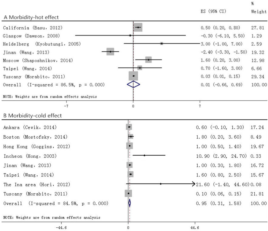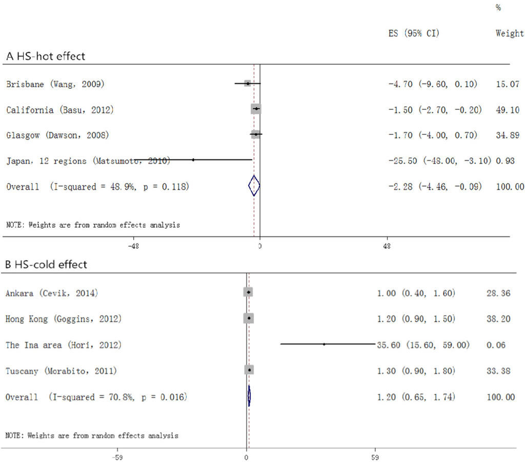 We separately calculated the cold and the hot estimate effects, as all of the studies included in our analysis did. The statistical analysis includes 2 stages: in the first stage, we converted all effect estimates into a relative risk; in the second stage, we obtained the ultimate effects using the meta-analyses.