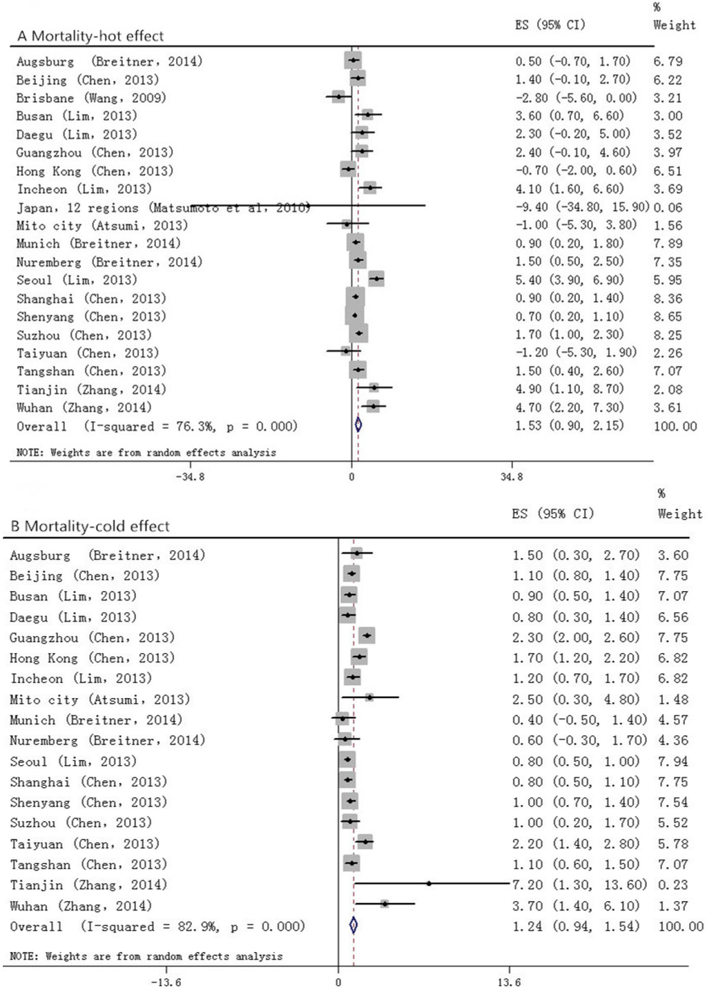 Figure 4. Forrest plots for relationship between the temperature change and stroke mortality. A and B stand for hot and cold effect, respectively.