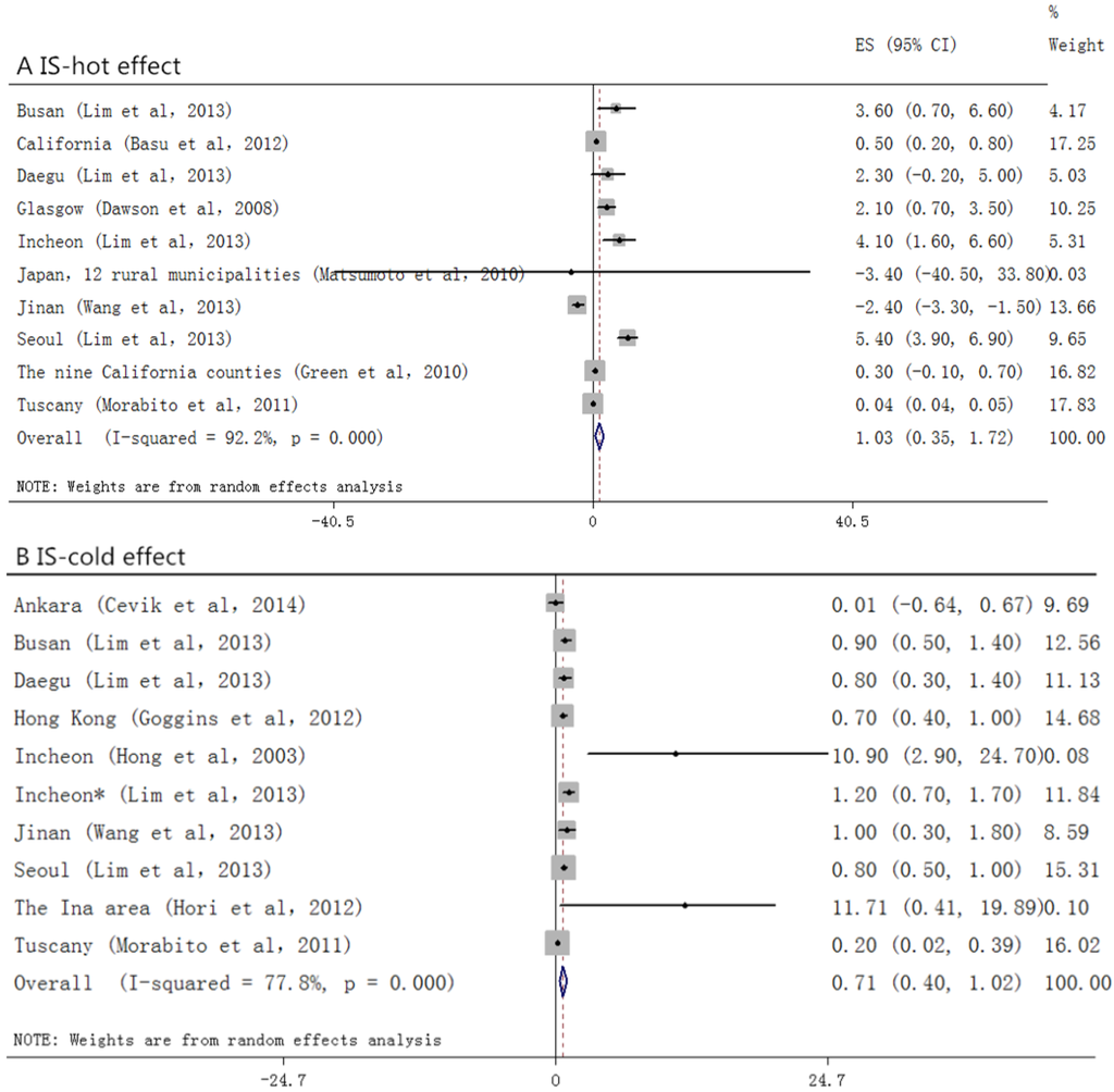 Figure 6. Forrest plots for relationship between the temperature change and IS. A and B stand for hot and cold effect, respectively.