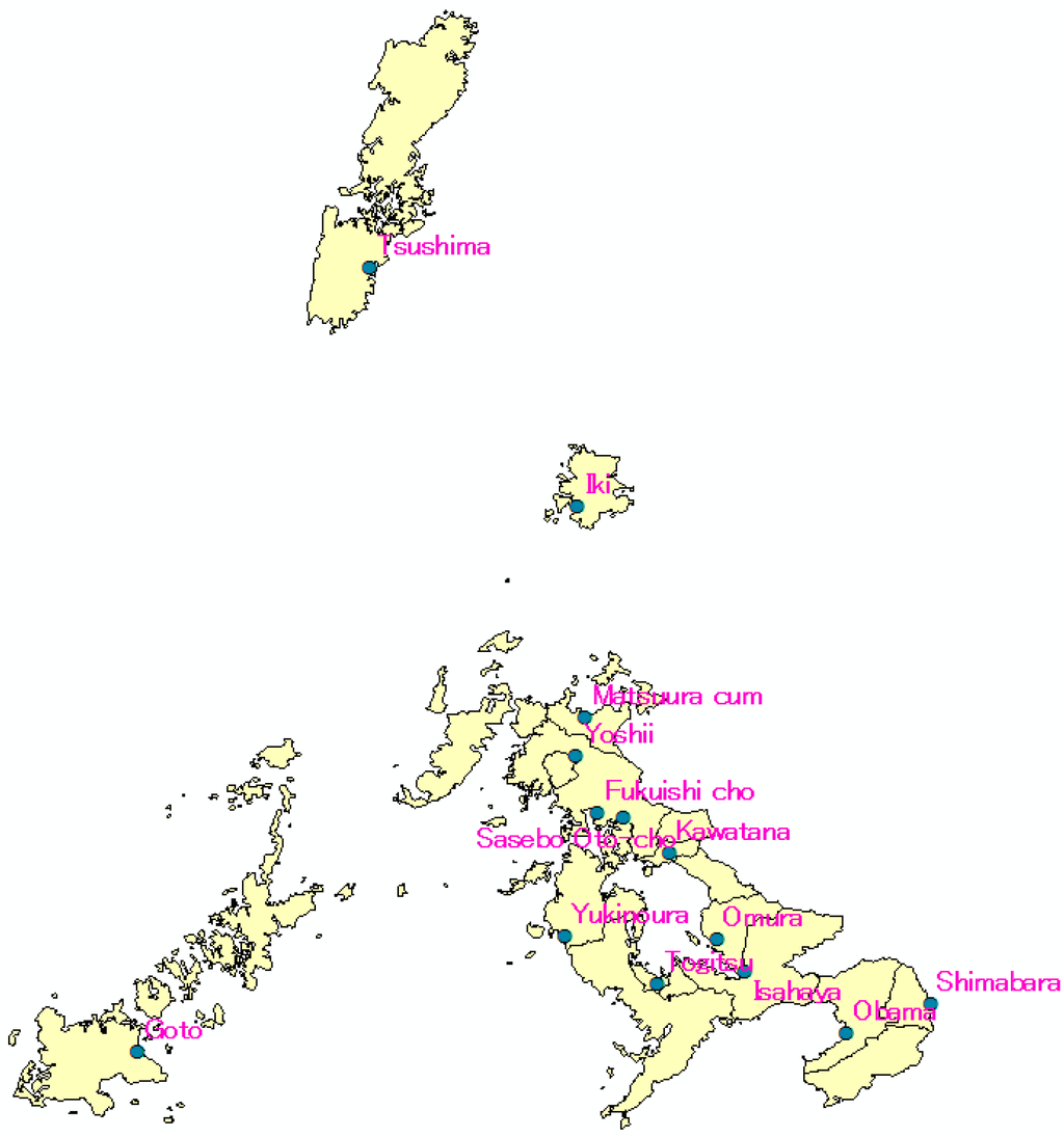 Figure 2. PM2.5 monitoring stations in Nagasaki prefecture.