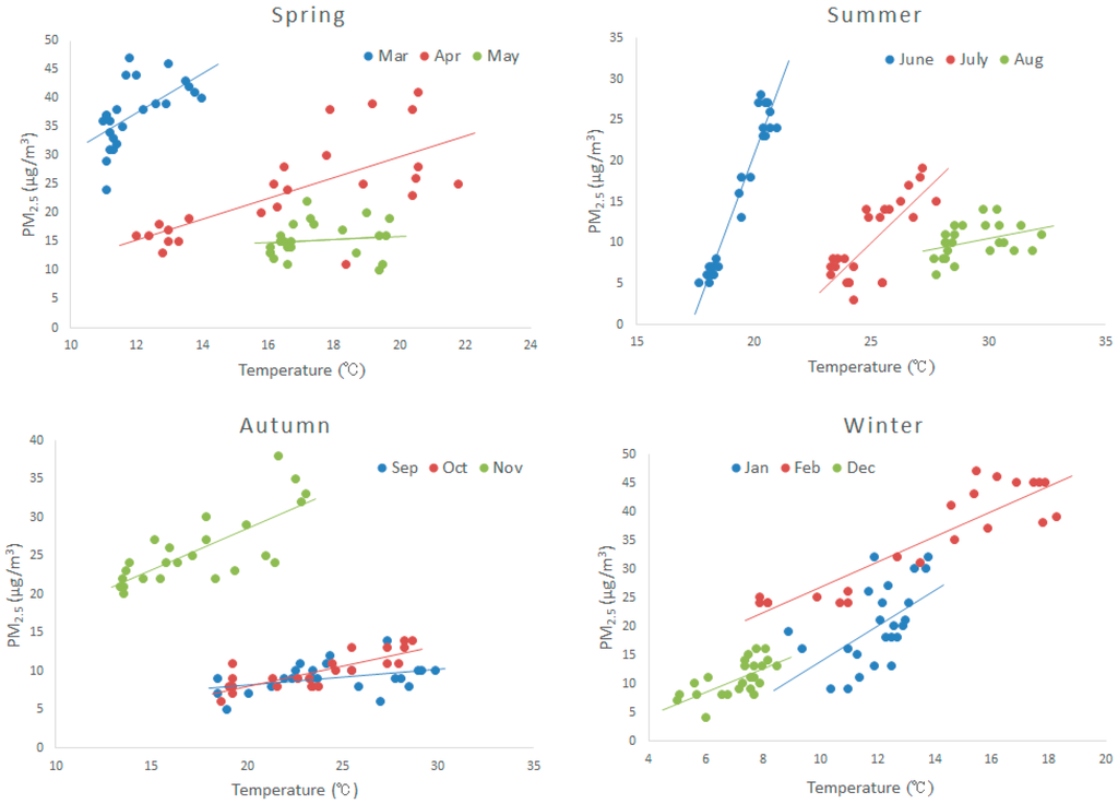 Figure 4. The relationship between PM2.5 and temperature over four seasons. The straight lines are the unary linear regression.