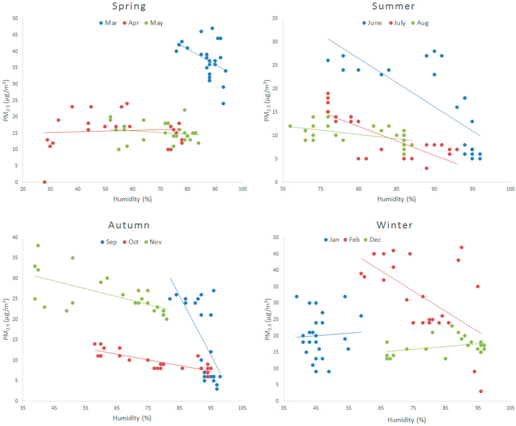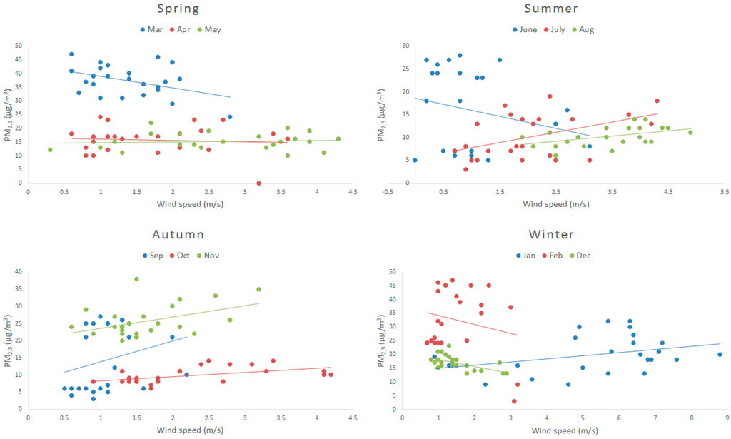 Figure 4 shows the relationship between PM2.5 and temperature. For the majority of the months PM2.5 has a strong positive correlation with temperature. This is because temperature can affect the formation of particles; thus, the high temperature can promote the photochemical reaction between precursors.
