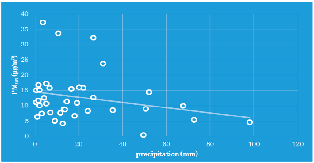 Precipitation can effectively decrease PM2.5 mass concentrations through wet deposition (Figure 7). Precipitation can effectively remove atmospheric particulate matter, especially of small size. The linear regression and Spearman analysis indicated that the correlation between PM2.5 and precipitation was negative with coefficients of −0.0606 and −0.197. The minus means negative correlation, that is, the PM2.5 concentration decreases with increasing precipitation.