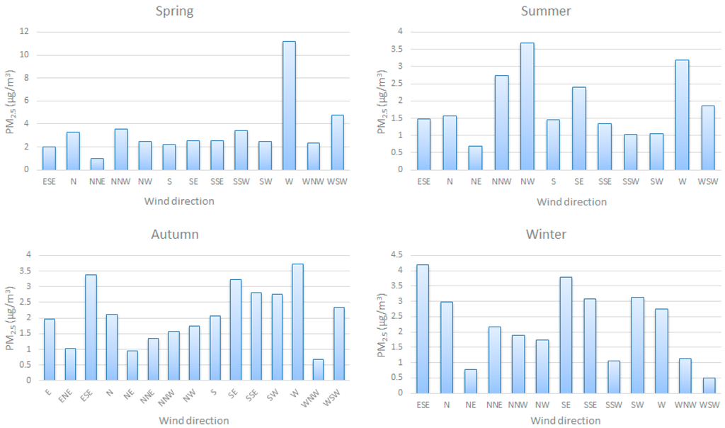 Wind direction is crucial to determine PM2.5 concentrations that result from pollutants by long range transport in Nagasaki. Pohjola et al. [17] has implied that PM10 concentrations originate mainly from local vehicular traffic (direct emissions and resuspension), while the PM2.5 concentrations are mostly of regionally- and long-range transported origin. The weighted PM2.5 values by wind speed were used to distinguish which direction brings the most pollutants from outside of the study area.