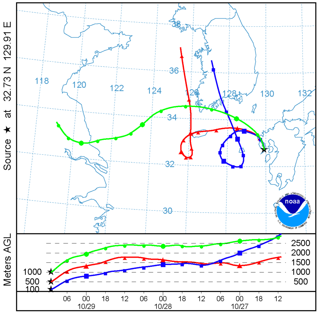 This can be verified by the back trajectories of air parcels obtained by the HYSPLIT model, as shown in Figure 9, which shows the sources could be East Asia.