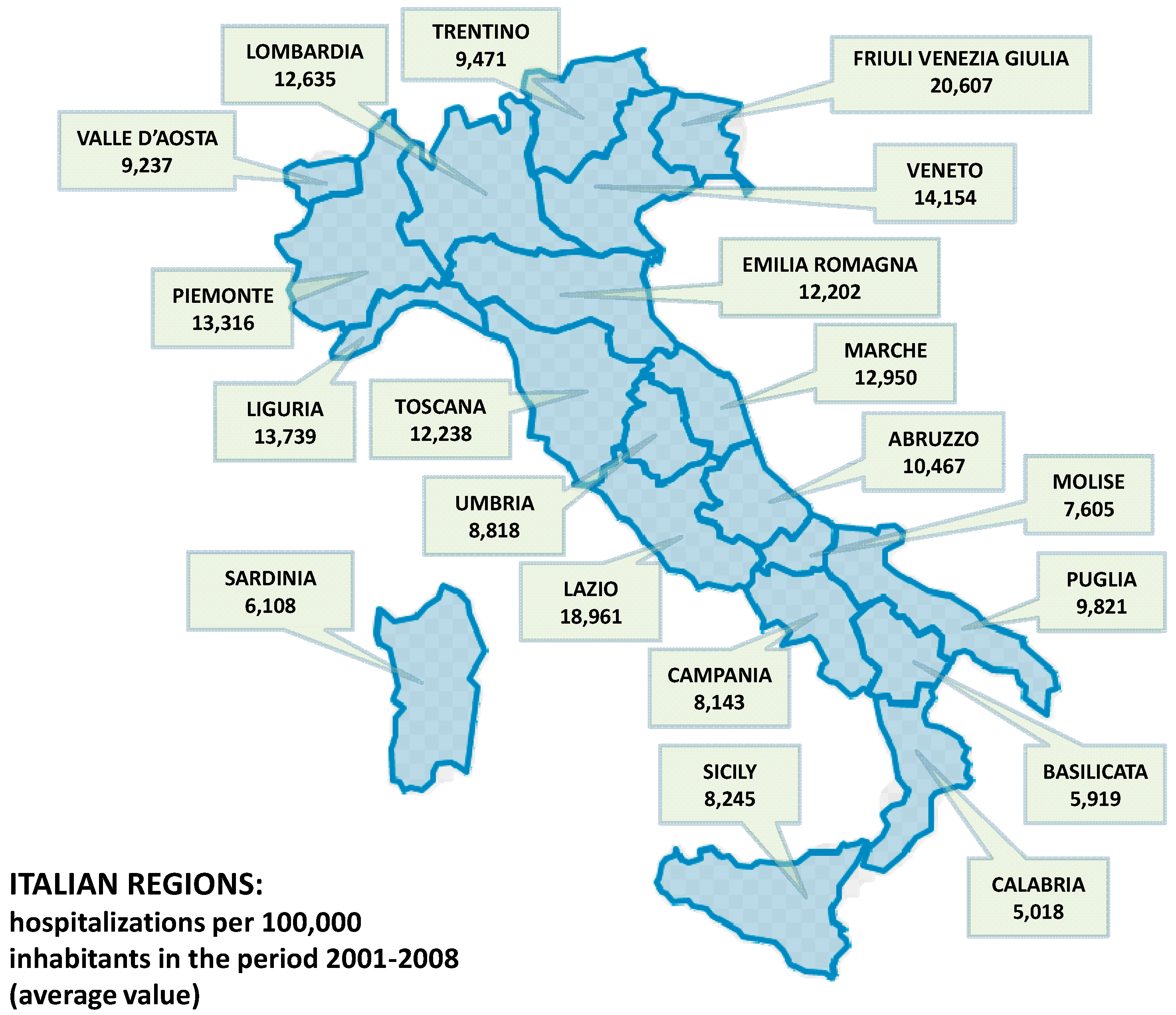 The standardized hospitalization rate per 100,000 inhabitants was computed by referring to the Italian population