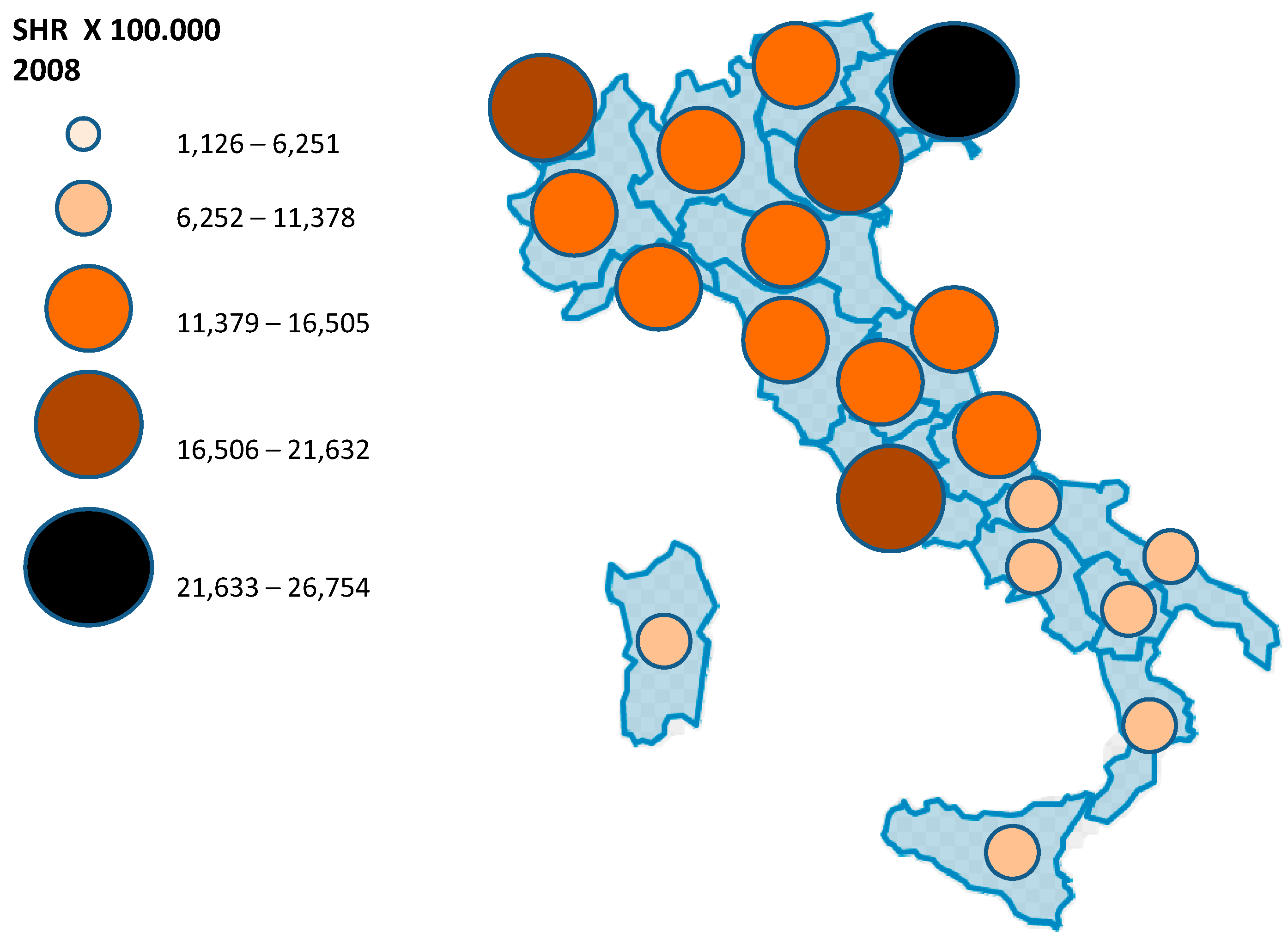 Standardized Hospitalization rate per 100,000 inhabitants (malignant skin Melanoma) displayed for each Italian region as average value 2001–2008.
