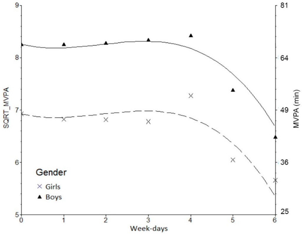 Our multilevel modelling results indicated a nonlinear trend in MVPA levels with a very modest increase during schooldays and a rapid decline from Friday to Sunday. Moreover, both gender and BMI category (between obese children and normal weight) were found to have significant effects on MVPA levels. Results for daily PA (Table 2) show that although boys and girls have similar weekly MVPA patterns, boys spend more time in MVPA than girls, regardless of the day, which is in accordance with sex-differences observed in PA among youth [57]. It has been suggested that boys tend to be more active than girls due to biological factors [58], but this may also be attributable to parental, social and environmental factors [57], which imply more time engaging in sports and free-living activities. Furthermore, boys typically view school breaks as a chance to engage in competitive games that tend to dominate play spaces in the school yard while girls view the school break period as a time for socializing [17], i.e., the majority of boys manifest competency by being active players in sports games and the majority of girls walk and talk [59]. On the other hand, throughout the after-school period there is some suggestion that parents perceive the neighborhood to be safer for adolescent boys compared to adolescent girls [60], given boys one more possibility to be physically active.