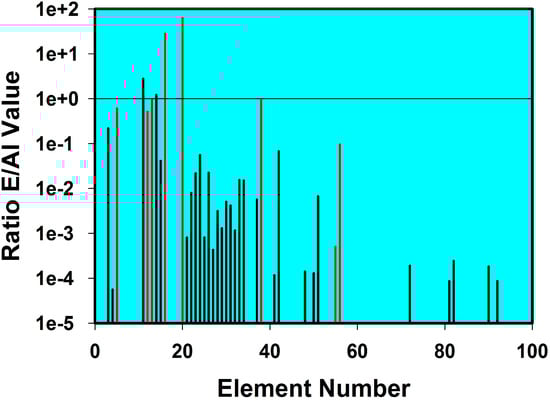 The average elemental composition of each of the 38 elements from the 23 different sources of European coal fly ash leach studied by Moreno et al. [], presented as ratios relative to aluminum, is shown in Figure 2 as a function of Atomic Number. Normalization to one common element, in this case aluminum, makes comparisons possible when total mass or total volume is not available. In this plot, the less abundant leachate element ratios are not shown. Note that aluminum (Atomic Number 13), strontium (38), and barium (56), elements which are sometimes determined in post-spraying rainwater, are relatively abundant.