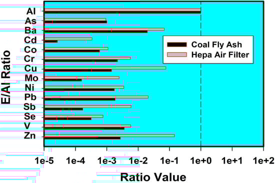 Figure 4 shows concentrations of 14 chemical elements, normalized to aluminum, measured in the Los Angeles HEPA air filter dust for comparison with corresponding average element ratios for un-leached coal fly ash data (Table 1) from [].