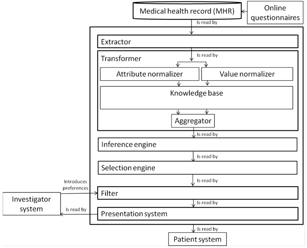 We analyzed the experience of the monitoring system with five health professionals (a neuropsychologist, a doctor, a social worker and two psychologists). Quantitative and qualitative information was collected by verbal reports protocol. This monitoring system has been implemented in Liferay Portal CE, which is available under the GNU Public License (LGPL) v2.1. However, the results of this system are not available to the public and there is a published patent [] of the standardization method. MATLAB was used for the different plots []. Figure 1 shows the flowchart of the standardization of the ICF and its integration in the monitoring system, which is comprised of an extractor, a transformer, an inference engine, a selector, a filter and a presentation system. The extractor access databases and selectively fetches information. The transformer performs the standardization of attributes and values (performed by the attribute normalizer and value normalizer respectively) and aggregates the information. Then, the inference engine performs when necessary the inference of values from other attributes. The selector selects the relevant information depending on the particular profile being analyzed. The filter enables the personalization of data visualization enabling filtering by a plurality of parameters. Finally, the presentation system enables the graphical representation of all normalized data.