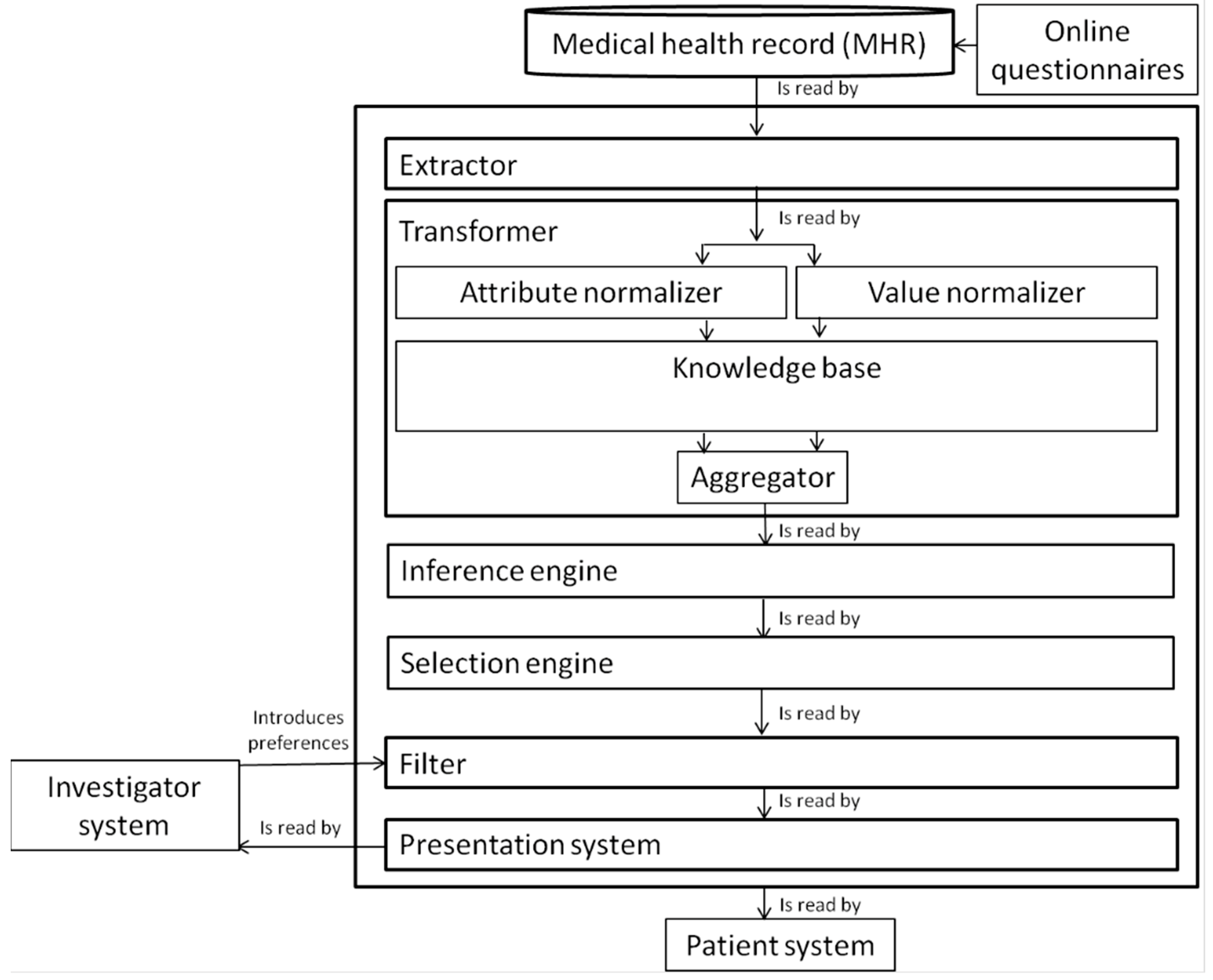 We analyzed the experience of the monitoring system with five health professionals (a neuropsychologist, a doctor, a social worker and two psychologists). Quantitative and qualitative information was collected by verbal reports protocol. This monitoring system has been implemented in Liferay Portal CE, which is available under the GNU Public License (LGPL) v2.1. However, the results of this system are not available to the public and there is a published patent [30] of the standardization method. MATLAB was used for the different plots [31]. Figure 1 shows the flowchart of the standardization of the ICF and its integration in the monitoring system, which is comprised of an extractor, a transformer, an inference engine, a selector, a filter and a presentation system. The extractor access databases and selectively fetches information. The transformer performs the standardization of attributes and values (performed by the attribute normalizer and value normalizer respectively) and aggregates the information. Then, the inference engine performs when necessary the inference of values from other attributes. The selector selects the relevant information depending on the particular profile being analyzed. The filter enables the personalization of data visualization enabling filtering by a plurality of parameters. Finally, the presentation system enables the graphical representation of all normalized data.