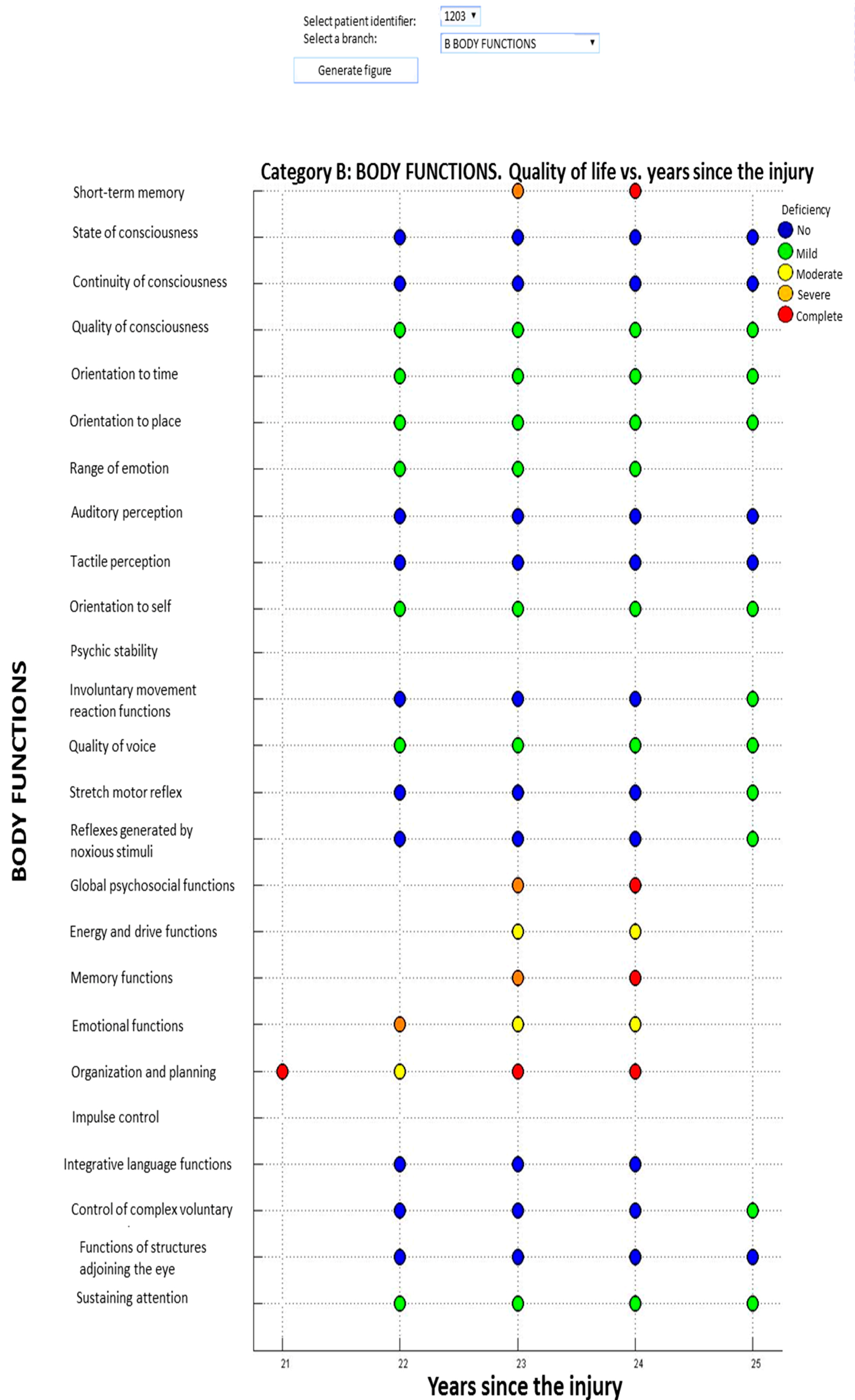 Figure 2 represents information related to the evolution of the health of the person, represented as a set of indicators based on the elapsed time from injury. Values of limitation, deficiency or restriction are represented as follows: red/4 complete level, orange/3 severe level, yellow/2 moderate level, green/1 mild level, and blue/0 no level for of any limitation, deficiency or restriction. The professional can quickly distinguish in red those categories with greater impairment.