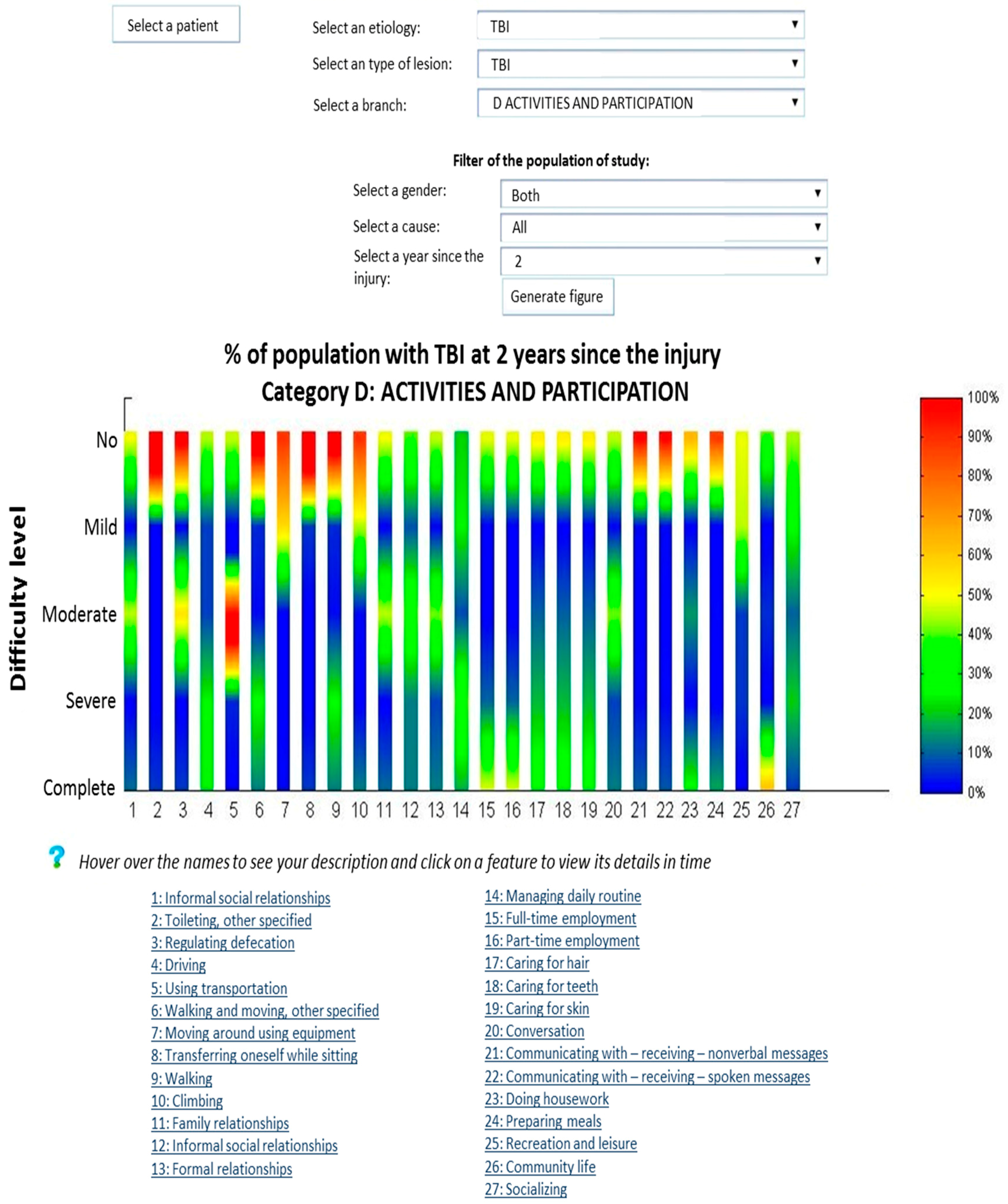 Graphical representation of the situation of the population of traumatic brain injury (TBI) and individuals through the ICF categories.