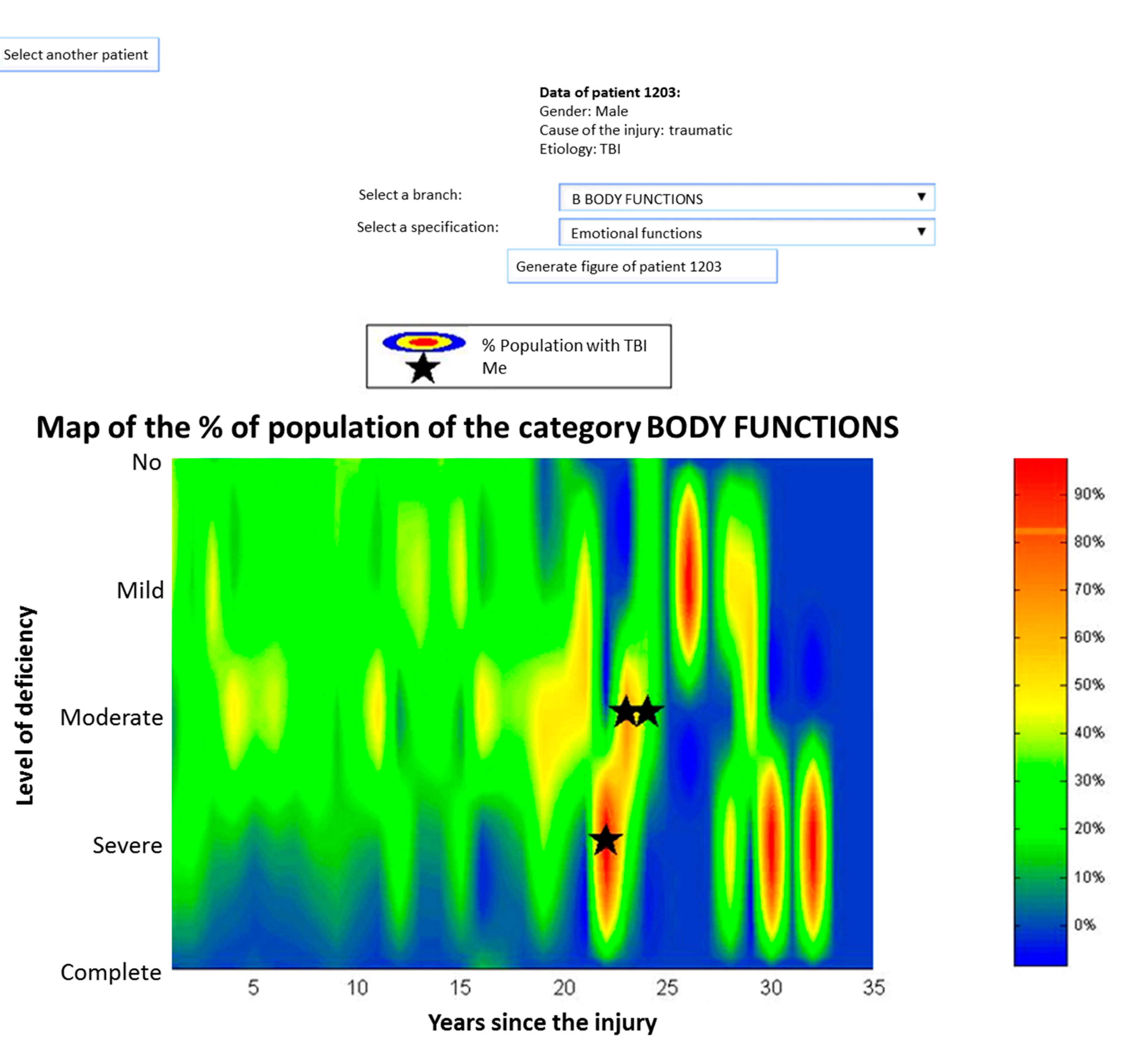 Anna is the (anonymized) name of a 43-year woman from Barcelona who suffered a head injury due to a car accident 26 years ago. After completing her regular assessment at the Institut Guttmann, a psychologist visits her and displays a graphical monitoring system that represents the state of the person individually and compared with people with the same disease. The CDSS helps her psychologist to predict problems in emotional functions and executive functions.