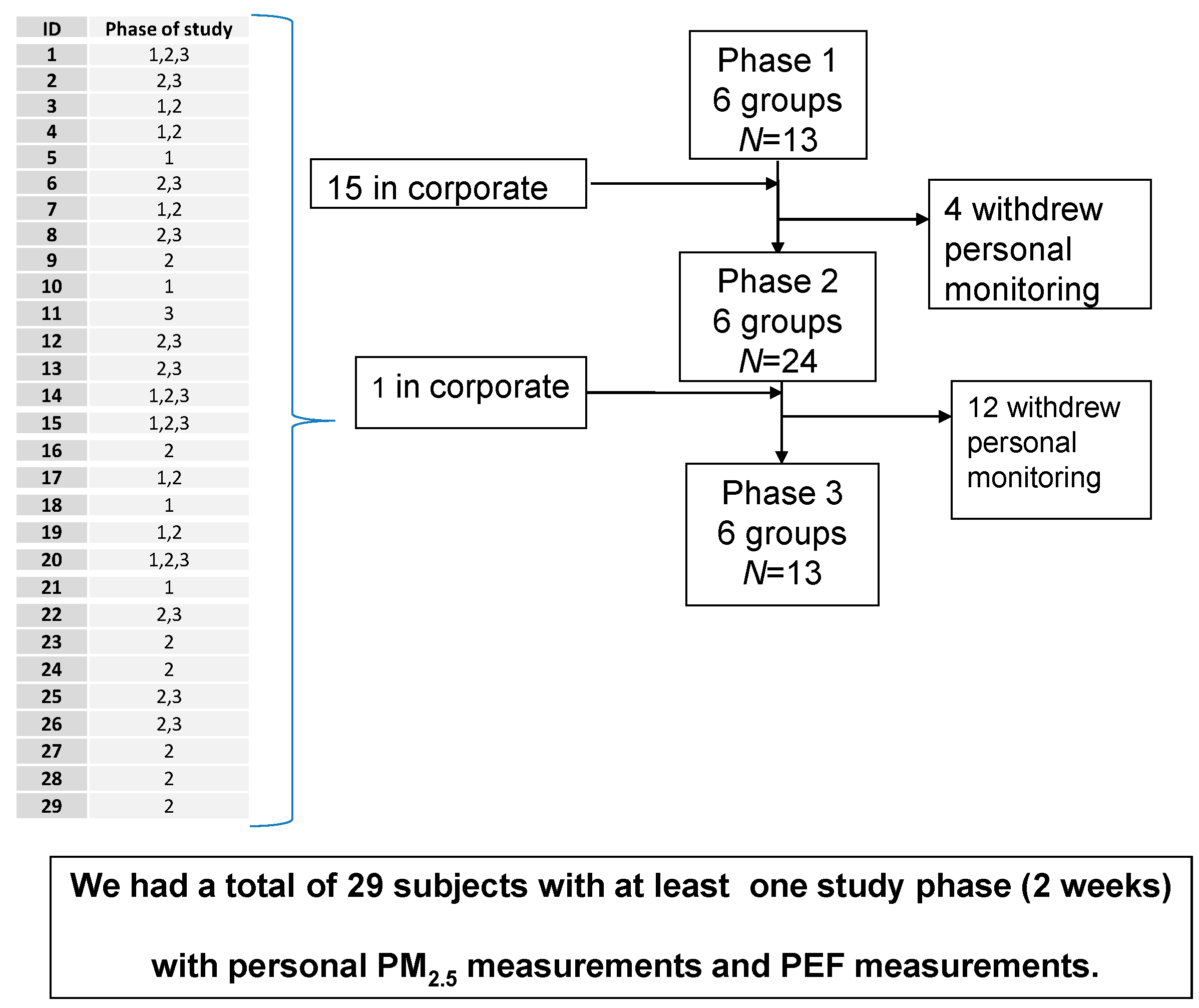 A total of 29 adults, nine female and 20 male subjects, participated in the study. Their age range was 43‒80 years, and mean age was 69 years. According to the classification of COPD severity recommended by Global Initiative for Lung Disease (GOLD) [34], seven participants were classified as having moderate or stage II COPD (26.7%), 13 as having severe or stage III COPD (43.3%), and nine as having very severe or stage IV COPD (30%). Based on the daily activity questionnaire, participants spent 90% of their time indoors during the study period (Table 1). Of the 29 participants, four completed three personal-monitoring phases, 14 completed two phases, and 11, only one phase. Between the first and second monitoring Phases 1 and 2, four subjects withdrew from the study and 15 were newly recruited in order to compensate for the loss of study subjects. Each study phase consisted of two weeks (12 consecutive days). However, personal monitoring entailed several problems with both the equipment and with the participants. Thus, it was not possible to meet this goal and we did not have the same number of PEF as Personal Monitors. The number and flow of subjects during the personal monitoring phases are depicted in Figure 1.