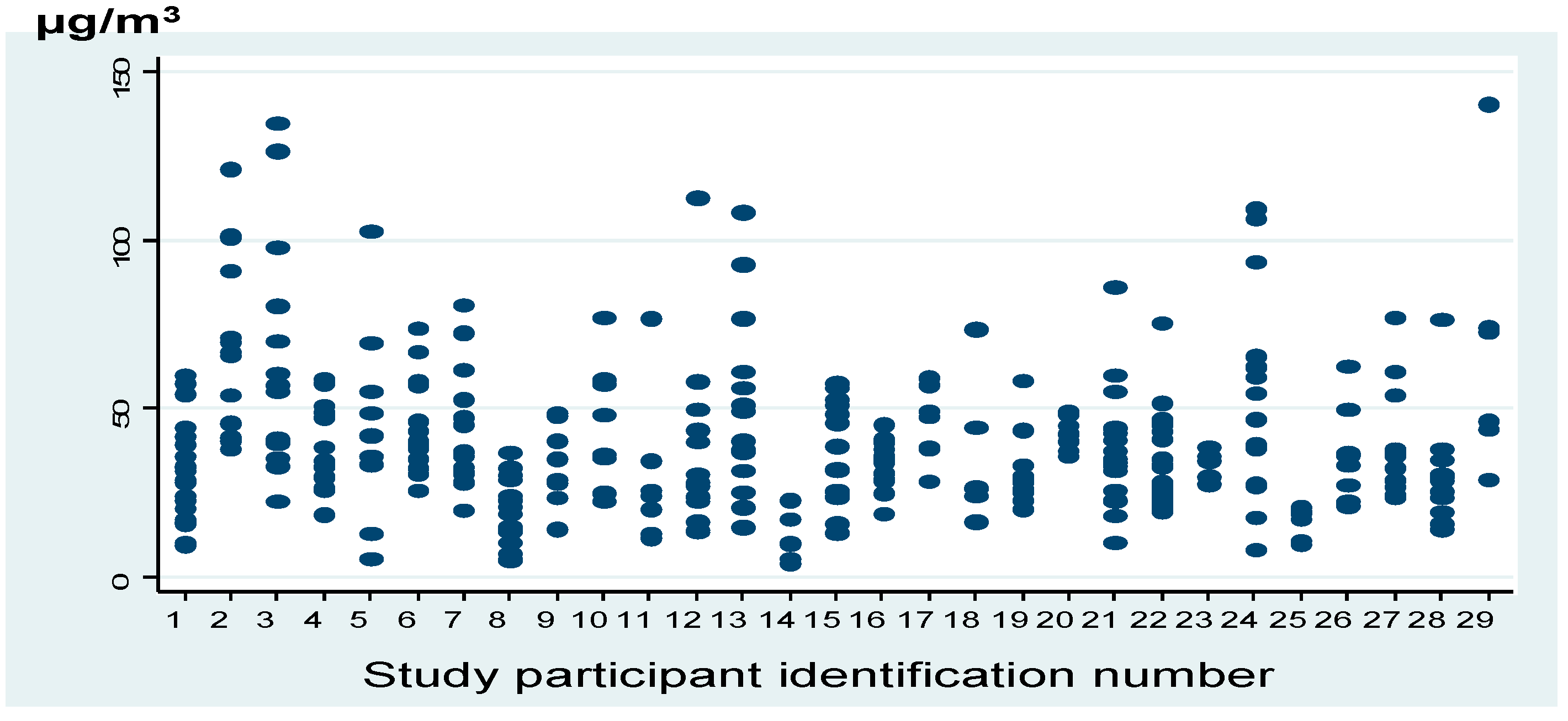 Figure 2 illustrates variability by participant of personal exposure to PM2.5 considering internal and external sources. Daily average concentrations of personal PM2.5 were 38.4 µg/m3, and the 5th, 50th and 90th percentiles were 10.9, 34.0, and 66.0 µg/m3 during the study period, respectively.