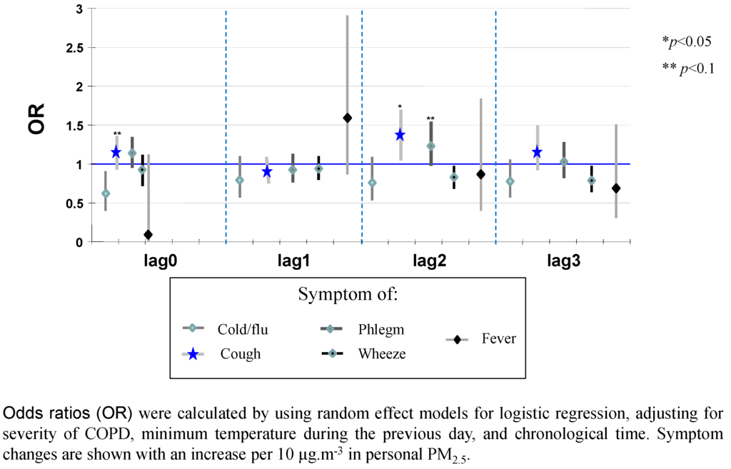 There was significant and positive association between personal exposure to PM2.5 and respiratory symptoms such as cough and phlegm, adjusted for minimum temperature, the sampling day, or COPD severity. For each 10-µg/m3 increase of personal PM2.5, there was a 33% increase of cough (95% CI = 5%; 69%) and 23% in phlegm (95% CI = −2%; 54%) with a 2-day lag. Frequency of cough increased by 18% (95% CI = −2%; 41%) for each 10 µg/m3 increase in personal PM2.5 exposure on the same day. The remainder of the symptoms did not exhibit a positive association with exposure to PM2.5 (Figure 3).