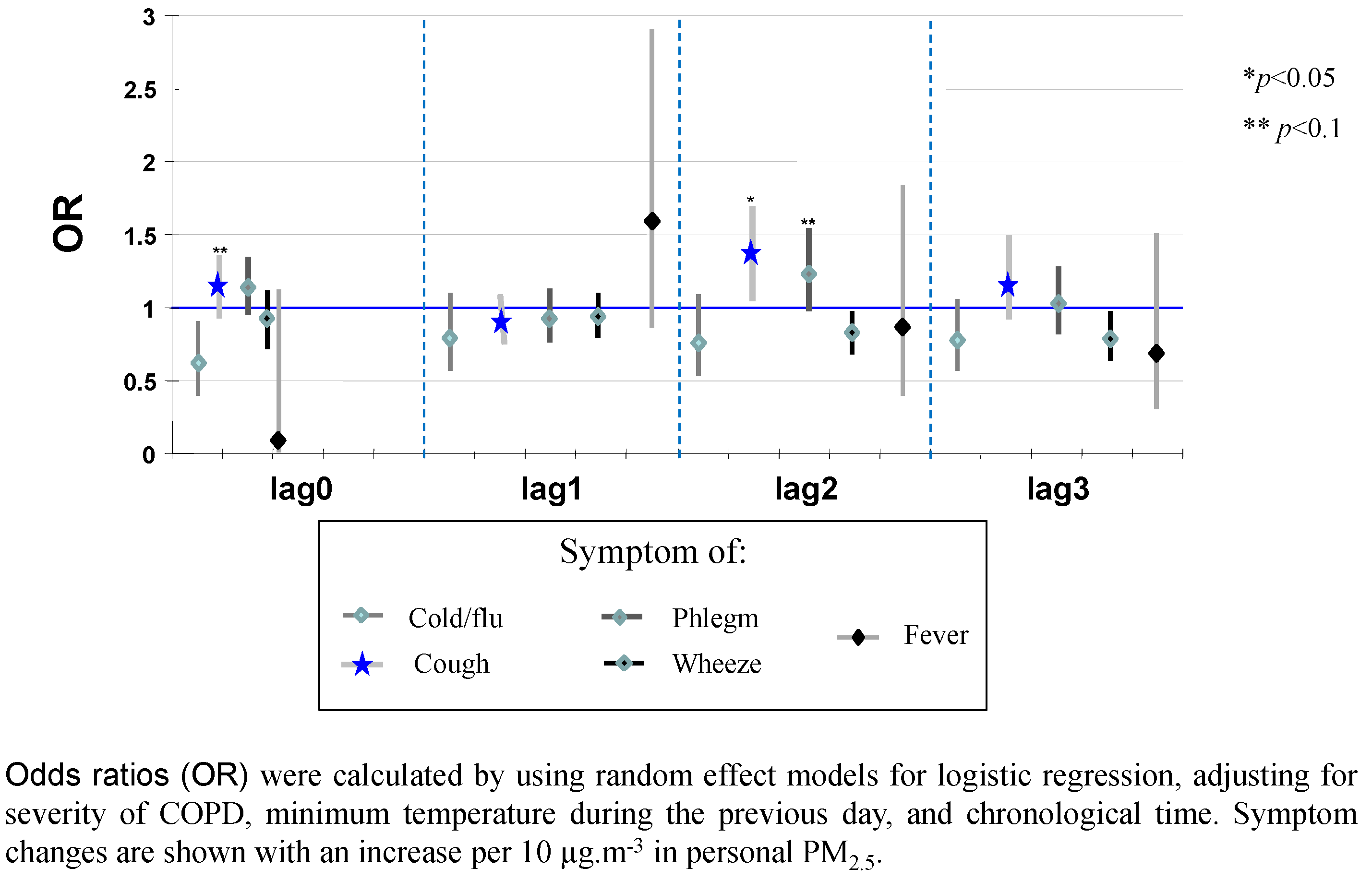 Prevalence of respiratory symptoms was calculated for each day of the study by employing the day as unit of analysis, and symptoms were registered as presence or absence of symptoms (1 = yes; 0 = no). The effects of personal PM2.5 exposure concentrations on symptoms (overall symptoms and specific symptoms) were evaluated using GEE, with a binary outcome. These associations were explored and analyzed for the same day and for up to six previous days (lag 0 to 6) utilizing random effect models for repeated measurements with the logistic link (xtlogit). Models were adjusted for potential confounding factors, including COPD severity, previous-day minimum temperature, and chronological time.