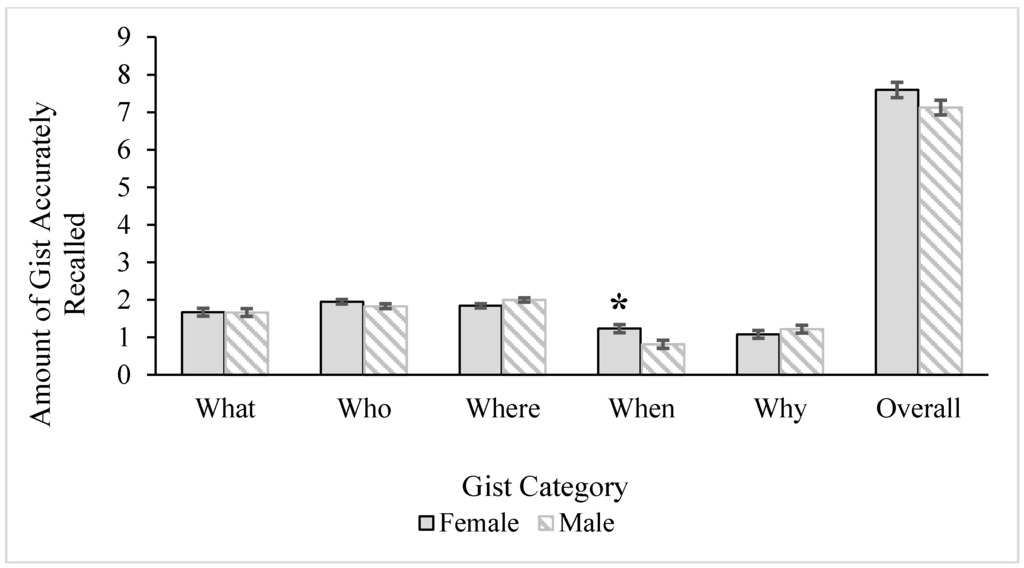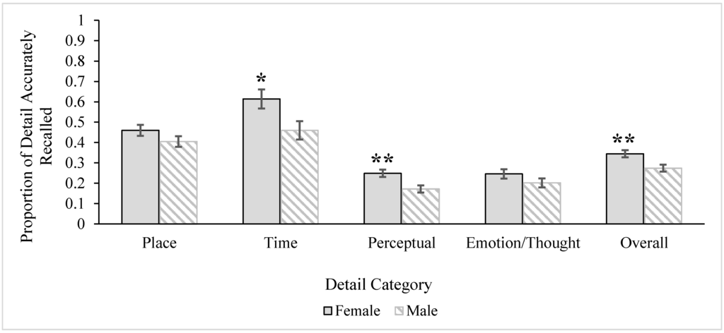 - Wang, Q. Gender and emotion in everyday event memory. Memory 2013, 21, 503–511. [Google Scholar] [CrossRef] [PubMed]
