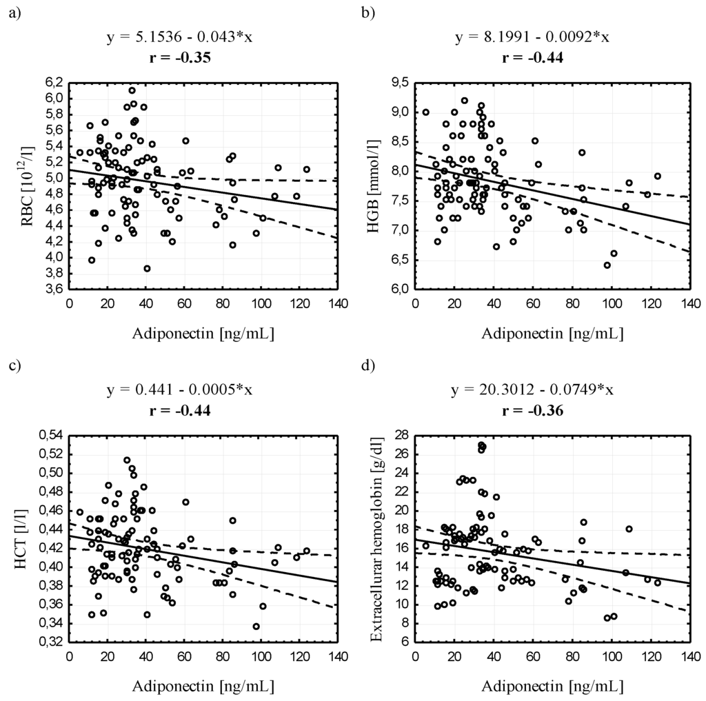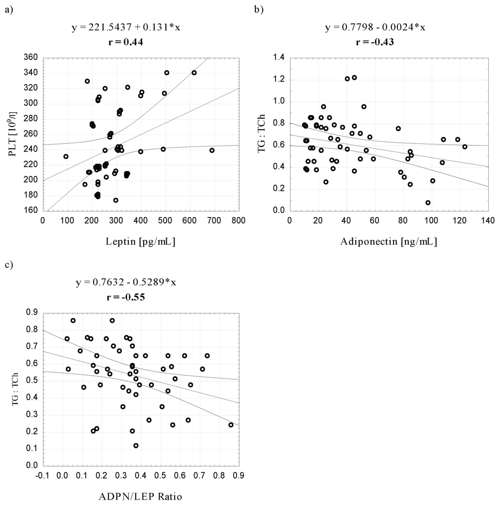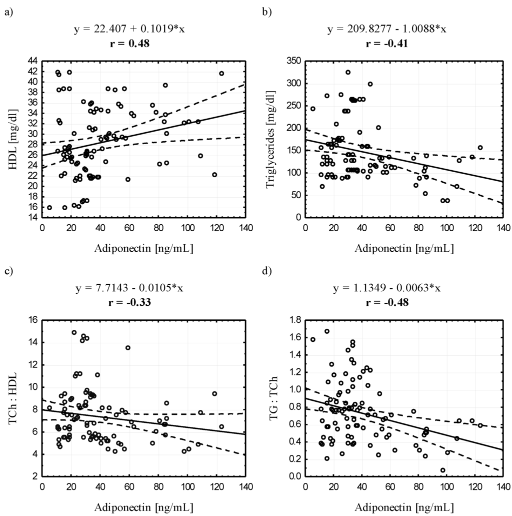The ADPN and LEP levels seem to correlate only with selected parameters (TG, HDL and LDL) and in a contradictory manner. Clinical studies have demonstrated a positive correlation between ADPN and total cholesterol, HDL [25,35,60,61] and LDL [35] and a negative correlation with TG [33,34,35,60], which is confirmed by the results of our study. ADPN seems to be a strong and independent protector of cardiovascular events [62].