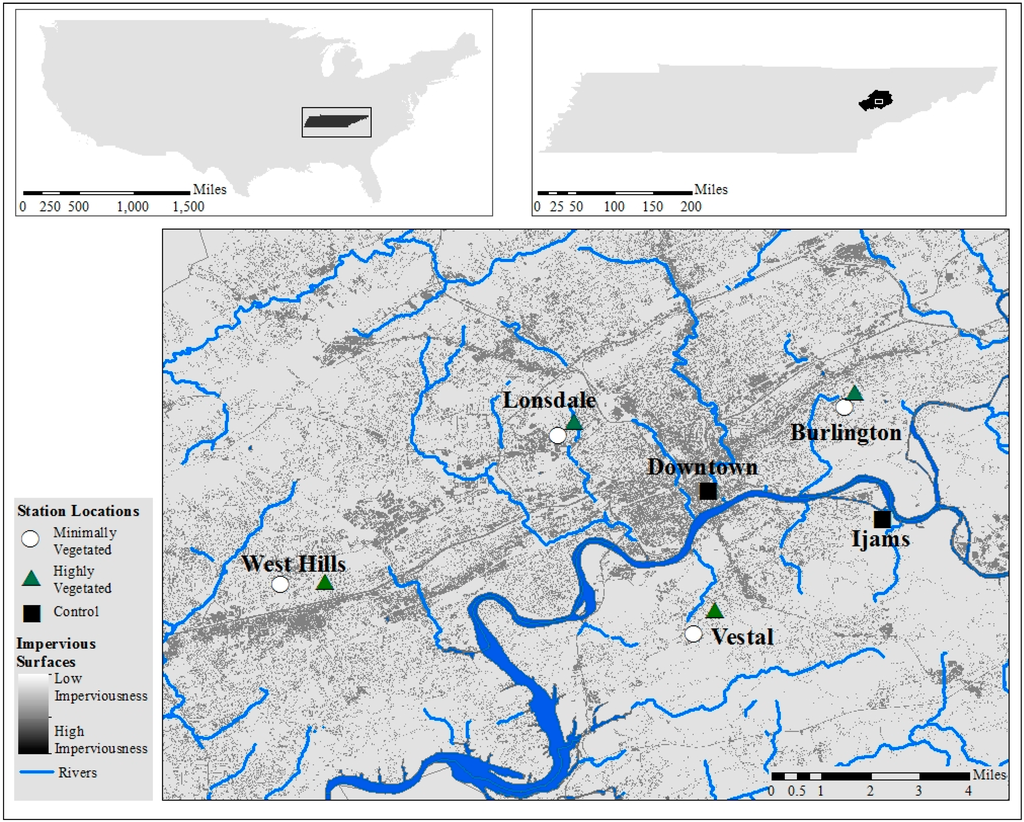 The stations began collecting data on 2 July 2014. This study analyzed data from 2 July 2014 through 30 September 2014 and 1 May 2015 through 1 July 2015. This data set covered a full warm season in Knoxville. Because of an act of vandalism at the Lonsdale MV location, data were not available for this location from 15–21 August 2014. Additionally, data sensor malfunctions resulted in data unavailability from 1–5 May at the Lonsdale MV station, 1–4 May 2015 at the West Hills HV station, and 1–5 May 2015 at the Burlington HV station.
