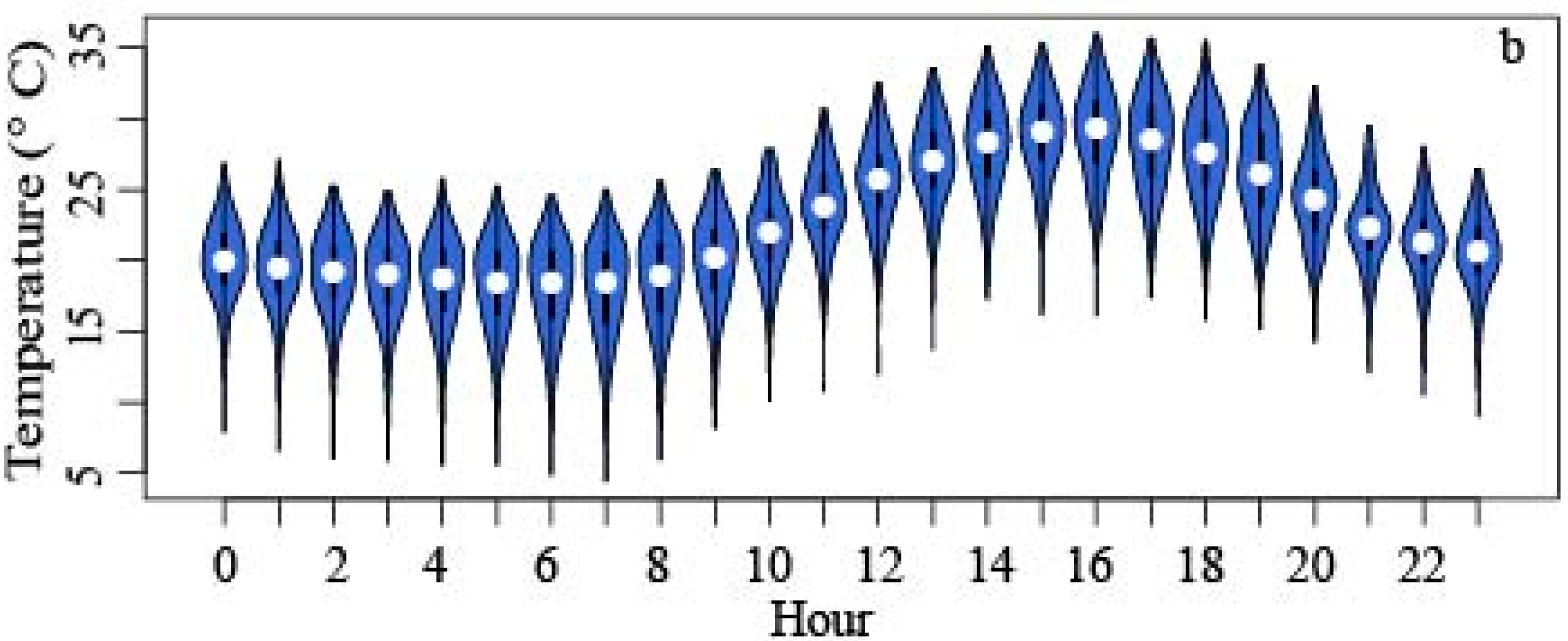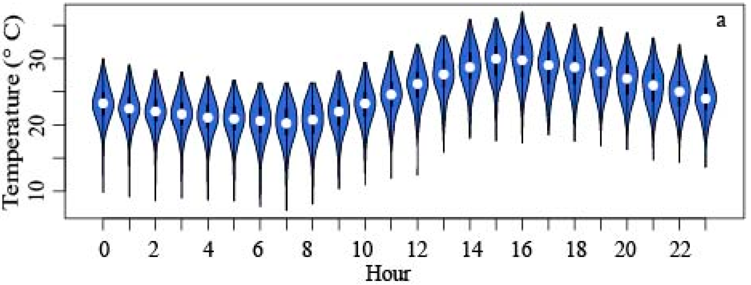 Figure 2. Hourly temperature distributions for Downtown (a) and Ijams (b) during the study period, including hour of the day and temperature.