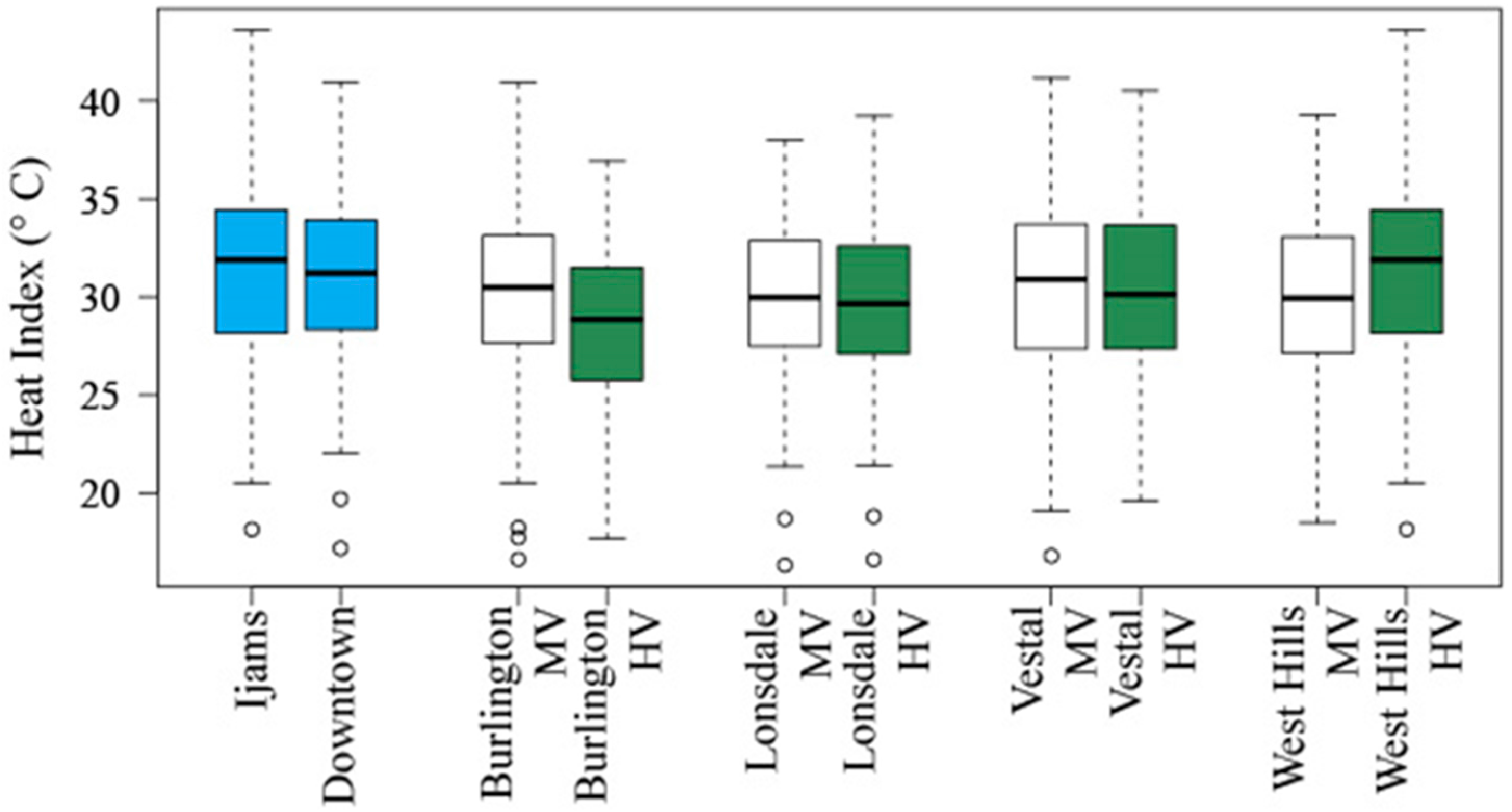 Station characteristics (location, elevation, etc.) are listed in Table 2, along with average T, RH, and HI during the study period. Sample size is provided and is based on the number of days available for testing after station malfunction and vandalism data were removed. Mean T and mean RH show the typical UHI pattern of warm and dry conditions in the downtown control location and cool and humid conditions in the Ijams Nature Center control location. Mean HI was highest downtown and at Ijams; lowest mean HI was in the HV locations of the four urban neighborhoods. Testing for significant differences between these values is discussed in Section 3.3, Section 3.4, Section 3.5, Section 3.6 and Section 3.7. The locations with the highest variation in HI during the warm season include Ijams and the HV station in West Hills (in order, respectively).