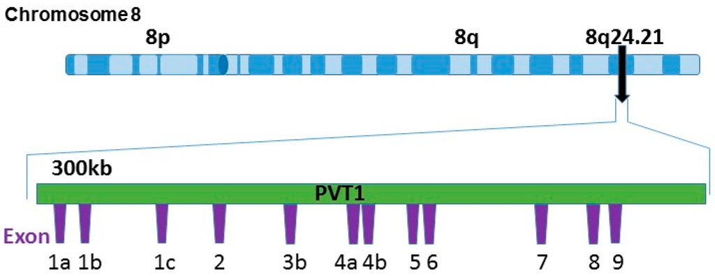 PVT1 localization on chromosome 8q24. PVT1 is a 300 kb long non-protein coding gene locus found at the 8q24 human chromosomal region. The PVT1 gene locus comprises at least 12 annotated exons.
