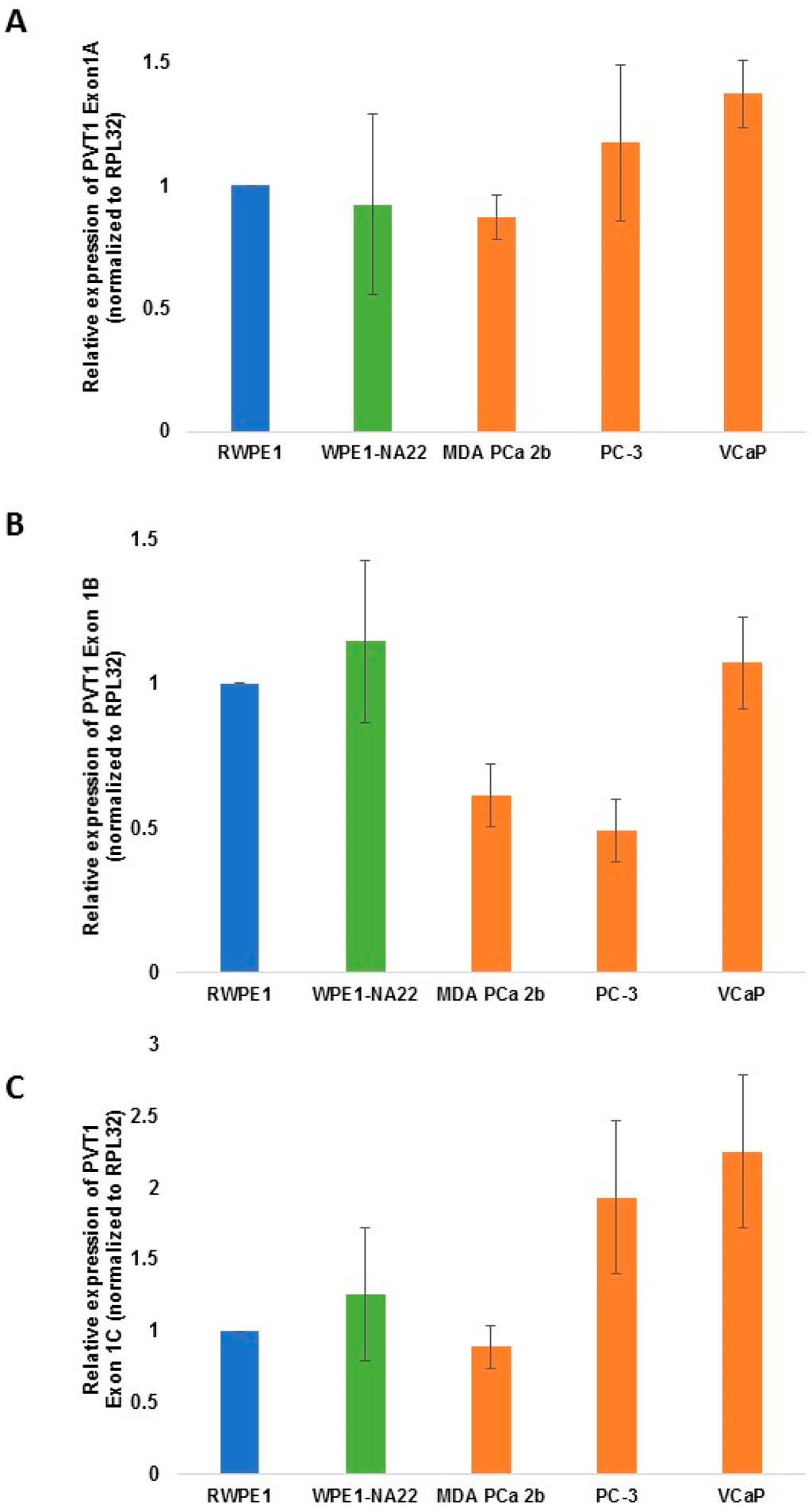 For PVT1 exon 1a and 1c, no significant differential expression was observed in the MDA PCa 2b PCA cell line derived from a male of African ancestry, when compared to the RWPE1 normal prostate epithelial cell line (Figure 2). For PVT1 exon 1b, a decrease in the expression level was observed in the MDA PCa 2b cell line, but it was not significant (Figure 2).