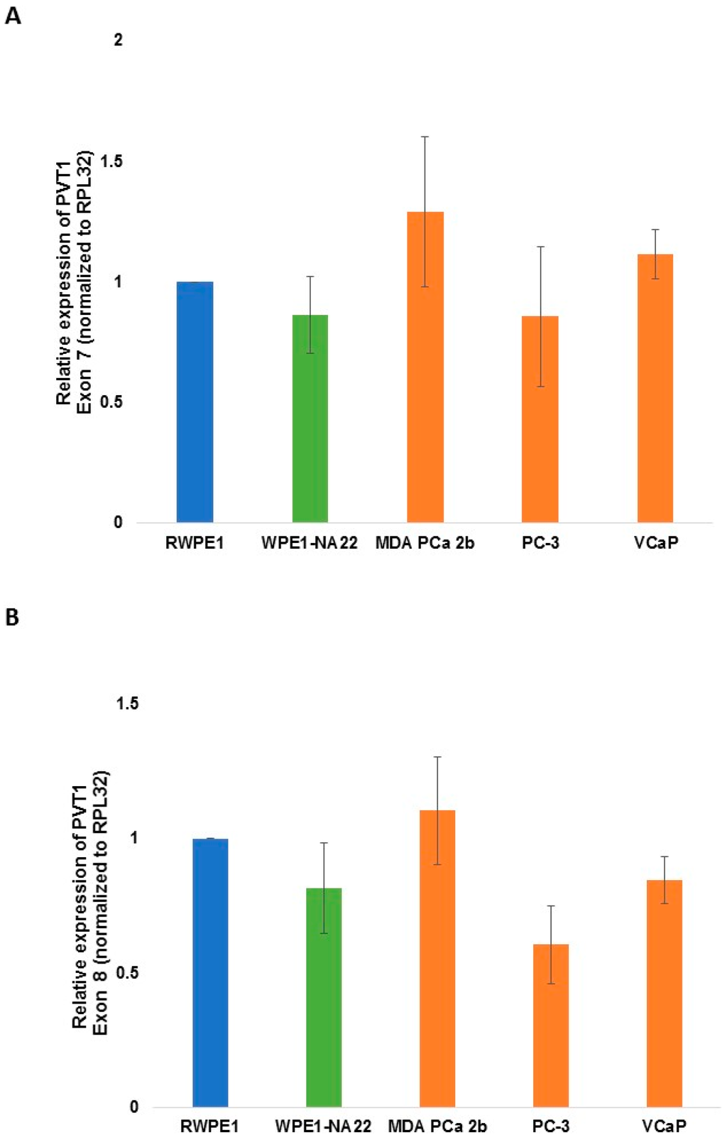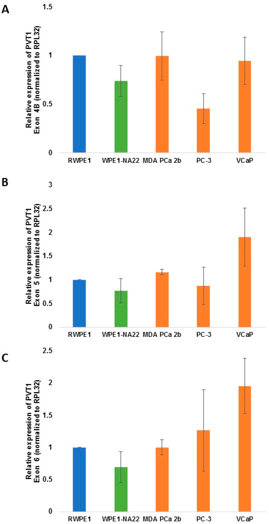 For PVT1 exons 4b, 5, 6 (Figure 4), 7 and 8 (Figure 5), there were no differential expression observed in comparing MDA PCa 2b to RWPE1.