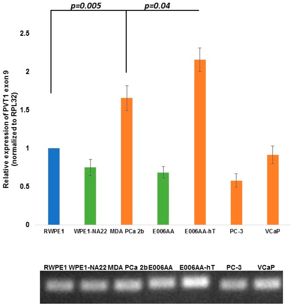 PVT1 exon 9 expression in non-tumorigenic and tumorigenic prostate epithelial cell lines. At least three independent qPCR experiments were performed and every experiment was set up in quadruplicates. The data showed that PVT1 exon 9 is consistently significantly overexpressed in the aggressive PCA cell lines derived from MoAA. The data are presented as mean + standard error of the mean (SEM) and the p values are displayed on the figure, and are compared to the control (RWPE1 cell line).