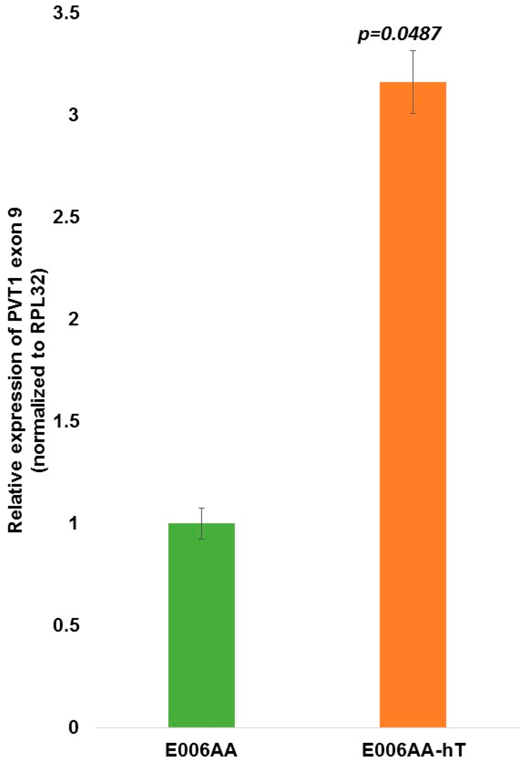 PVT1 exon 9 was the only one of all 12 exons of PVT1 that showed a very consistent and easily explainable expression profile. PVT1 exon 9 was significantly and consistently overexpressed in both aggressively tumorigenic cell lines derived from men of African ancestry. In both MDA PCa 2b and E006AA-hT cell lines, relative expression of PVT1 exon 9 in comparison to the RWPE1 cell line were approximately 200% (two-fold) higher (Figure 6). Interestingly, in comparing the E006AA non-tumorigenic cell line derived from a MoAA with its derivative, the aggressively tumorigenic E006AA-hT cell line, PVT1 exon 9 expression was about 300% higher in the E006AA-hT cell line (p = 0.0487; Figure 7). This indicates that PVT1 exon 9 is related to aggressiveness in this model of PCa in a MoAA.