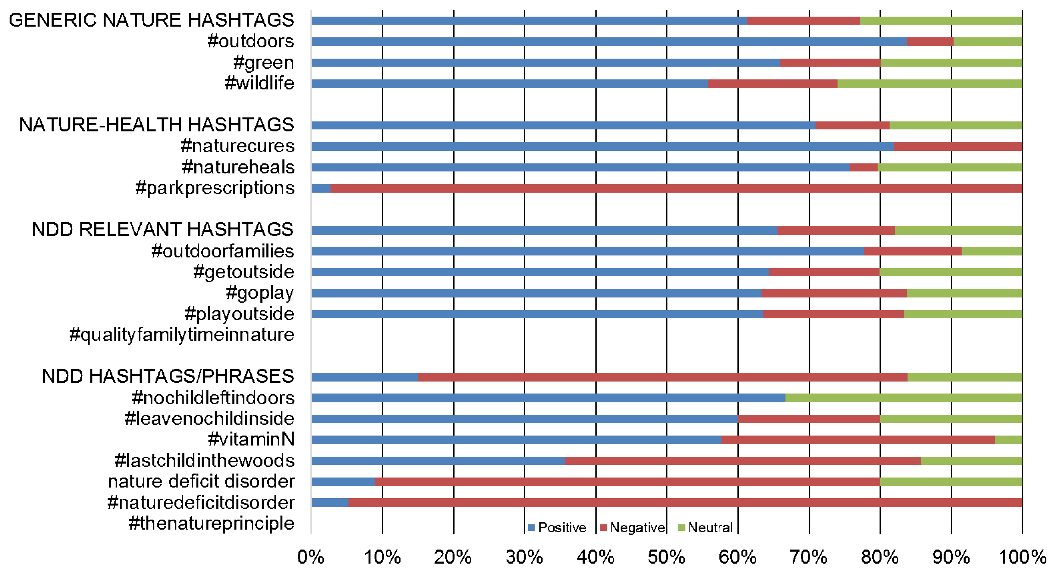 Although a number of online communities and portals to encourage and support people and organizations working nationally and internationally to connect children with nature have been created lately—for example, the Children & Nature Network (childrenandnature.org)—we did not focus our investigation on specific communities where NDD advocates are likely to gather up. Rather than monitoring particular websites, we aimed to capture the overall sentiment expressed in Twitter by anyone referring to NDD. Since the number of tweets published on a daily basis is too high (on a typical day, more than 500 million tweets are published; an average of 5700 tweets per second [31]), and most of them are unlikely to allude to NDD, we restricted our study to a collection of hashtags suggested by one of us (SW) and vetted among scholars with knowledge and involvement in the field of nature and human health. Such hashtags were selected to include phrases directly associated with NDD—e.g., #naturedeficitdisorder—phrases that were conceptually related to NDD—e.g., #playoutside—phrases about general nature and health—e.g., #natureheals—and also generic nature terms—e.g., #outdoors. Table 1 shows the whole list of hashtags involved in this study and the total number of tweets retrieved for each particular hashtag over the 2-month period that we investigated—between 1 July 2014 and 31 August 2014. The only phrase included in our study that is not a hashtag is “nature deficit disorder”, which appears in the NDD section of Table 1. Note that some of the hashtags in Table 1 do not refer to NDD explicitly, but to concepts and phrases connected to NDD. For instance, “Last Child in the Woods” is the title of the book where Louv introduced the term NDD; “Park Prescriptions” is a movement to create a healthier population by strengthening the links between the healthcare system and public lands across the US; and “The Nature Principle” is the title of another book by Louv—yet, no tweets including the hashtag #thenatureprinciple were posted while our research took place. Indeed, only one tweet including the #thenatureprinciple was posted in 2014 and this was on 7 September 2014—a week after our retrieval of tweets had ended.