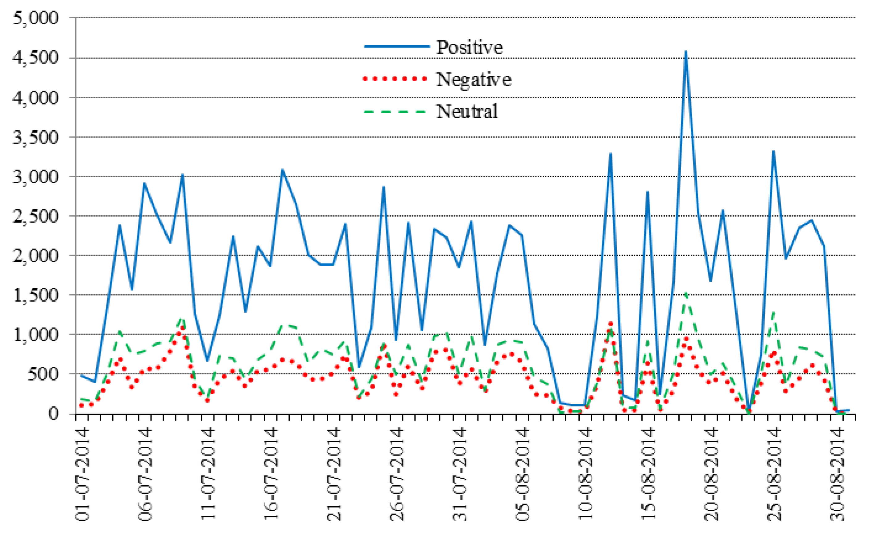 For illustration purposes, Table 2 displays a random sample of tweets taken from our study together with their corresponding polarity, score and mixed values, as retrieved from AlchemyAPI. For research purposes, AlchemyAPI offers its services for free. However, it only allows 1000 transactions daily—determining the polarity of one tweet represents a single transaction. From the 1000 transactions that we were allowed daily, we kept 5 for testing, and then we submitted a daily batch of requests for the polarity of 995 different tweets. Although the testing was only indispensable for the first few days, when our experience in using AlchemyAPI was limited, we maintained the same approach for the rest of the experiment, as this preserved a constant number of transactions daily without exceeding the daily limit.