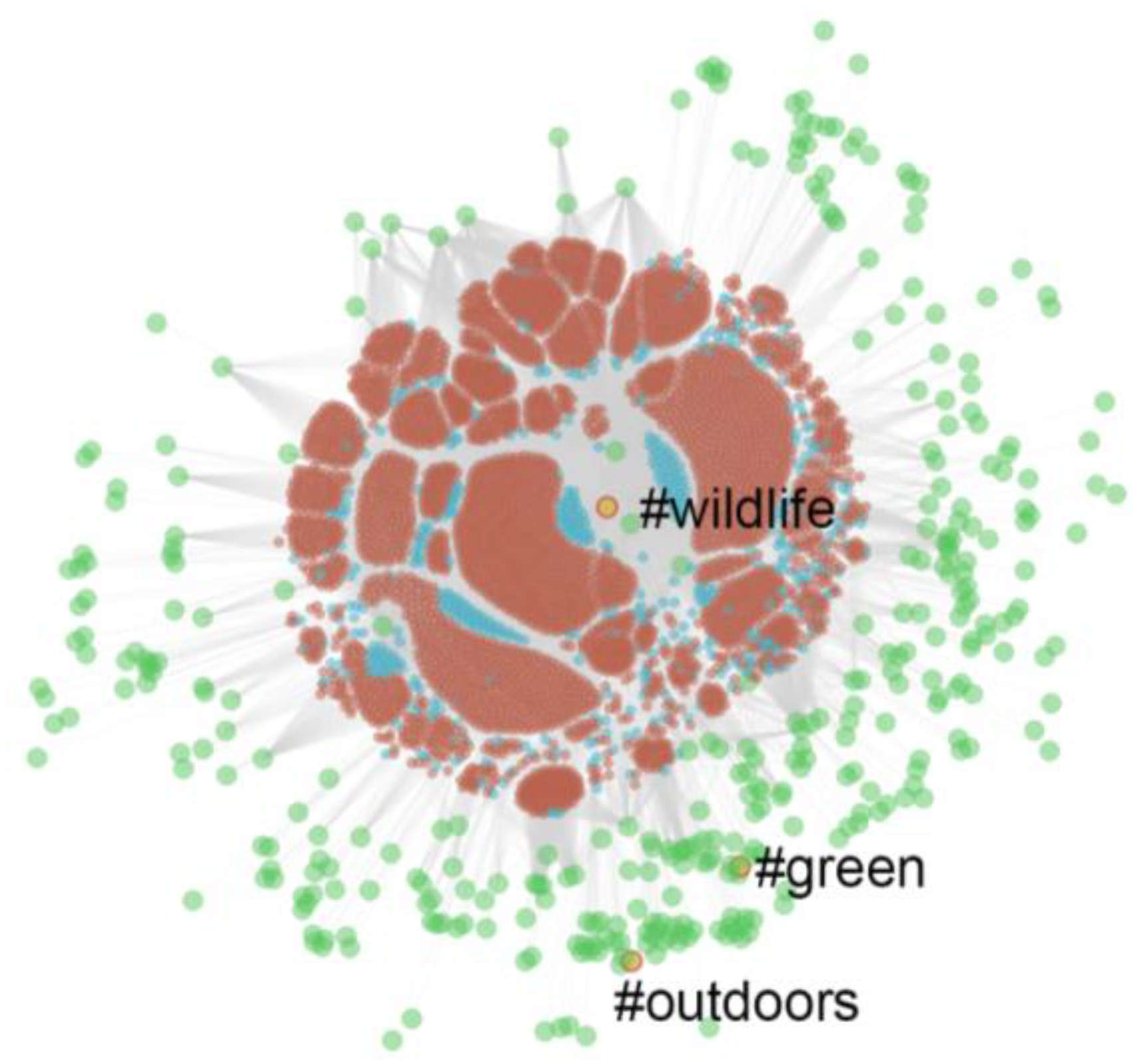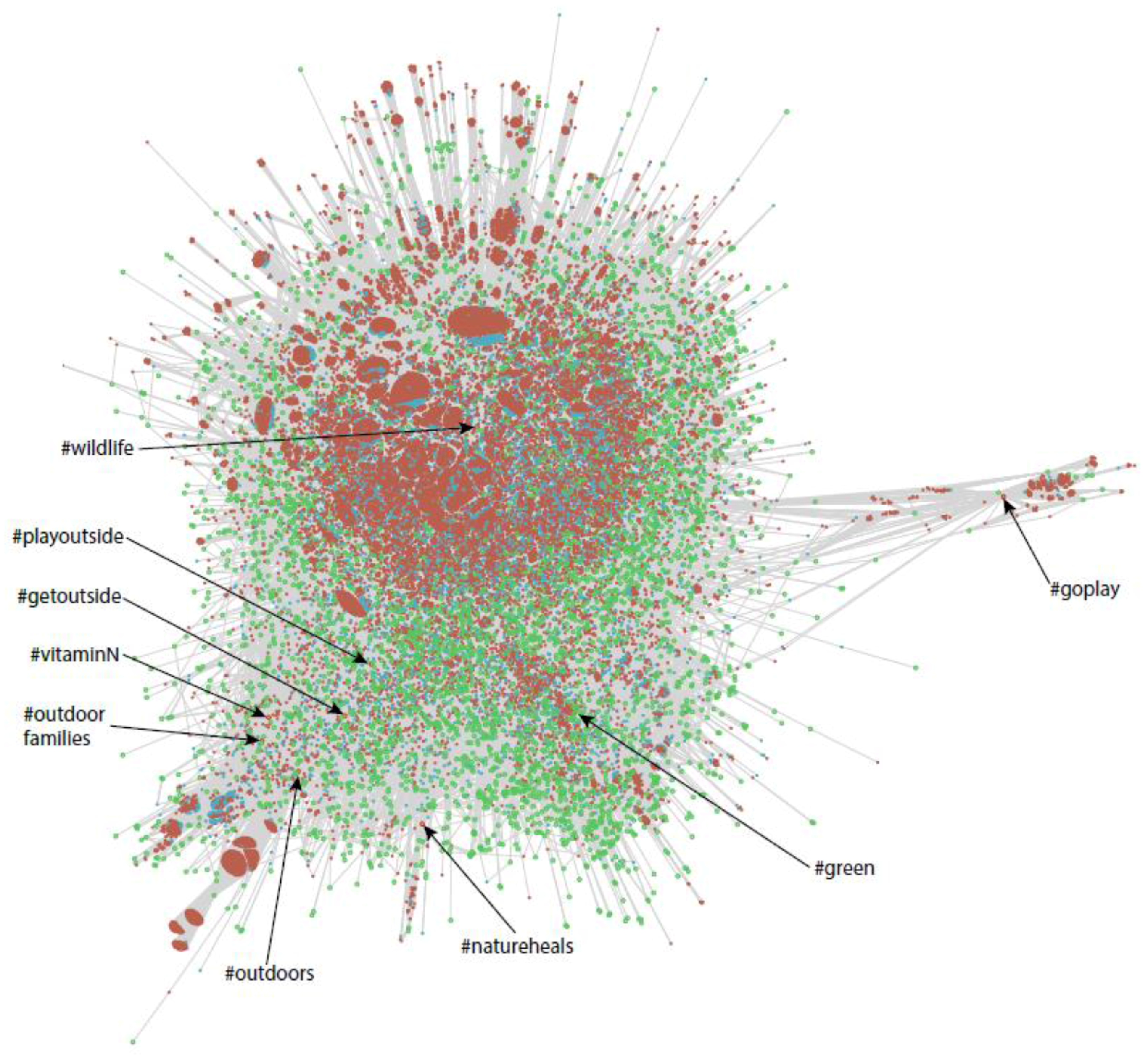 We have documented how the general Twitter traffic and sentiment in our dataset swells and ebbs over time; yet, it is consistently relatively positive about nature and health-related concepts. This is compatible with other research demonstrating positive emotions elicited in nature [66,67,68]. Force directed graphs were useful in showing the relationships between tweets and retweets—certain hashtags are shown to inhabit a different “space” in Twitter. The examination of hashtags that occur most frequently suggest that tweets with a nature–health hashtag may be more likely to contain elements that are suggestive of the spiritual transcendence that many people experience in nature [56]. Analysis of frequently occurring hashtags may also assist in the cleaning of datasets.