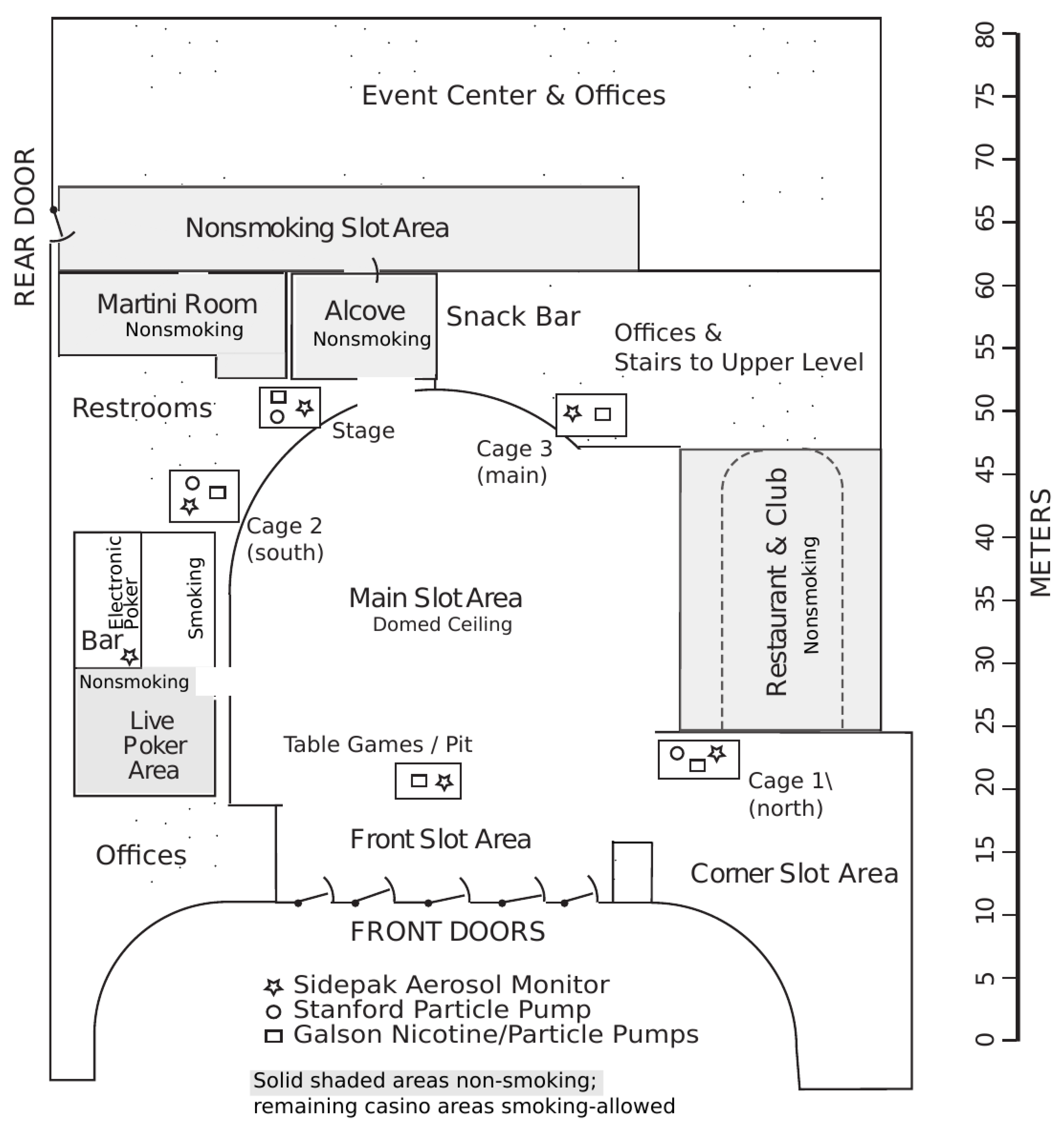 Schematic showing the casino layout and fixed-site air monitoring positions during the 2008 monitoring periods before the smoke-free policy was adopted. The layout was changed slightly in 2011 and further in 2014 subsequent to hotel construction, which was completed in December 2013. The poker area was moved to the martini bar area, and the corner slots area currently opens up to the hotel lobby.