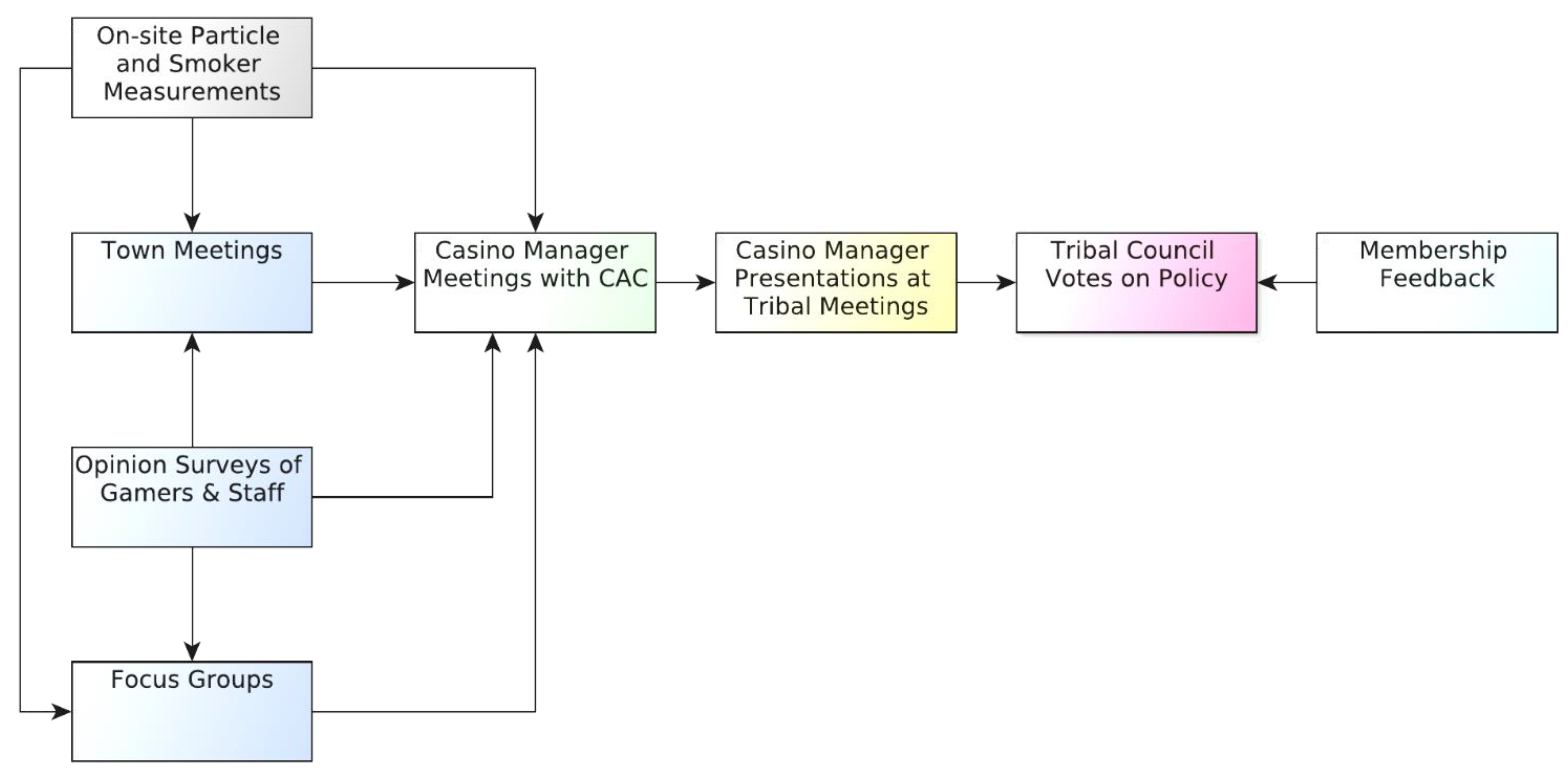 The CAC’s process included the collection of opinion data from Win-River Casino patrons, Win-River Casino employees, and Redding Rancheria employees. The Supplementary Information contains a tabulated history of activities and decisions by casino representatives related to the smoke-free policy (Table S1). The goals of the stakeholder activities were to: (1) Measure the level of support for a smoke-free casino by key community members, patrons and employees; (2) Identify barriers to the social and political acceptance of a smoke-free casino policy; (3) Gather perspectives on potential benefits of a smoke-free casino; and (4) Elicit patrons’ feedback on possible smoke-free implementation strategies. The CAC conducted the following four types of stakeholder-related activities: (1) Establishment of collegial relationships and agreements with the tribe and casino management; (2) Formal surveys of patrons, owners, and employees; (3) Administration of focus groups with patrons and community members who use casino facilities; and (4) Leading of a Town Hall meeting with patrons. In addition, the CAC was given access to data from annual organizational surveys performed by the casino and was allowed to perform key informant interviews with some Redding Rancheria staff. Figure 2 illustrates data categories and feedback linkages that were part of the CAC process. All data were summarized separately and shared with the casino General Manager, Mr. Gary Hayward, who presented them to the Tribal Council in support of a smoke-free casino policy. The presentation of the results of SHS environmental monitoring to all participants was a core element in focus groups, the Town Hall meeting, and interpersonal contacts.