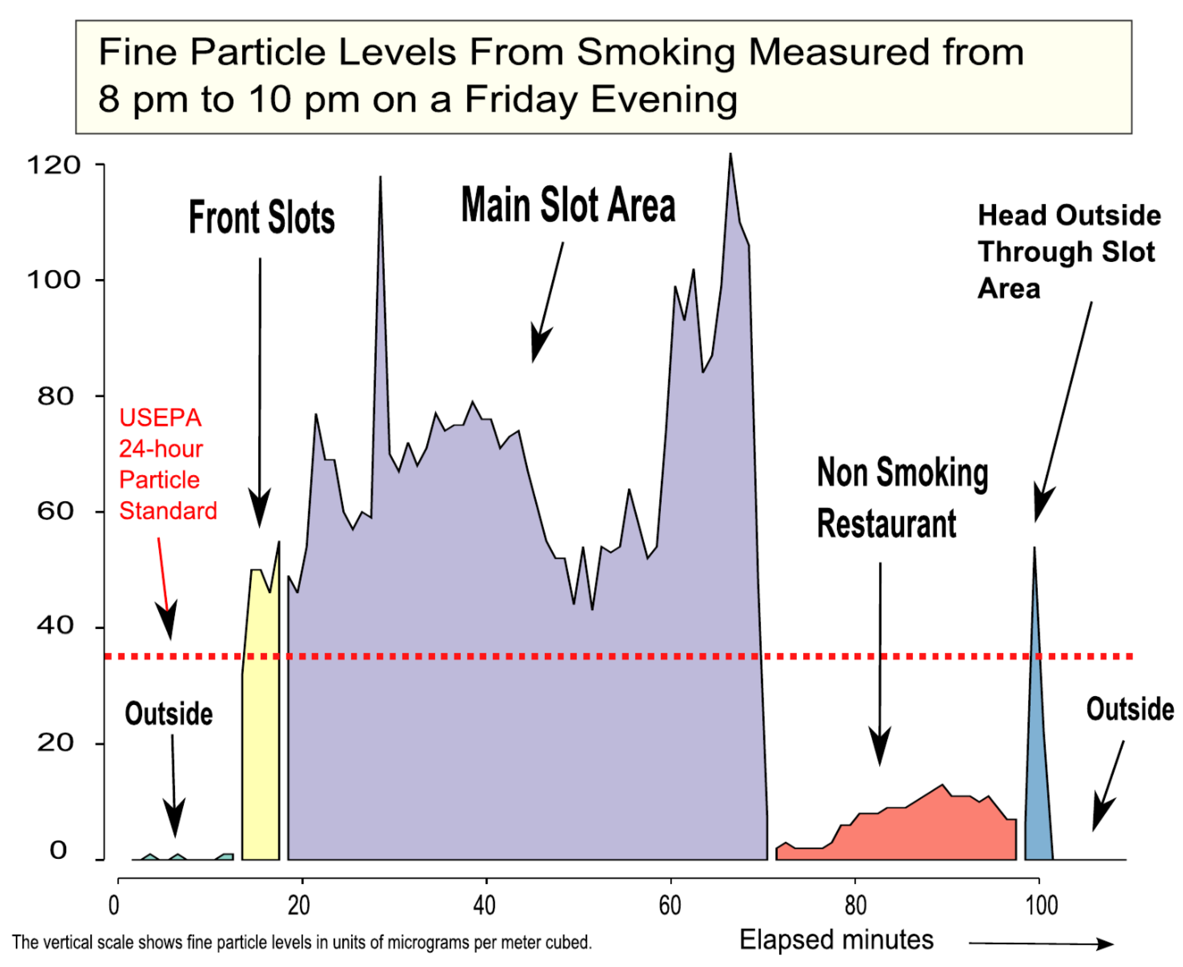 Despite the large number of casinos permitting indoor smoking in California and elsewhere, relatively few published data are available on casino air quality and personal exposures of casino visitors and staff to the airborne pollutants present in secondhand tobacco smoke (SHS), including PM2.5 (fine airborne particles). Casinos are unique indoor environments that are typically much larger than traditional pubs and restaurants, have more complex building layouts and ventilation systems, and, during peak hours, contain very large numbers of patrons, of whom roughly 5% to 20% are actively-smoking at a time [4,5,6,7].