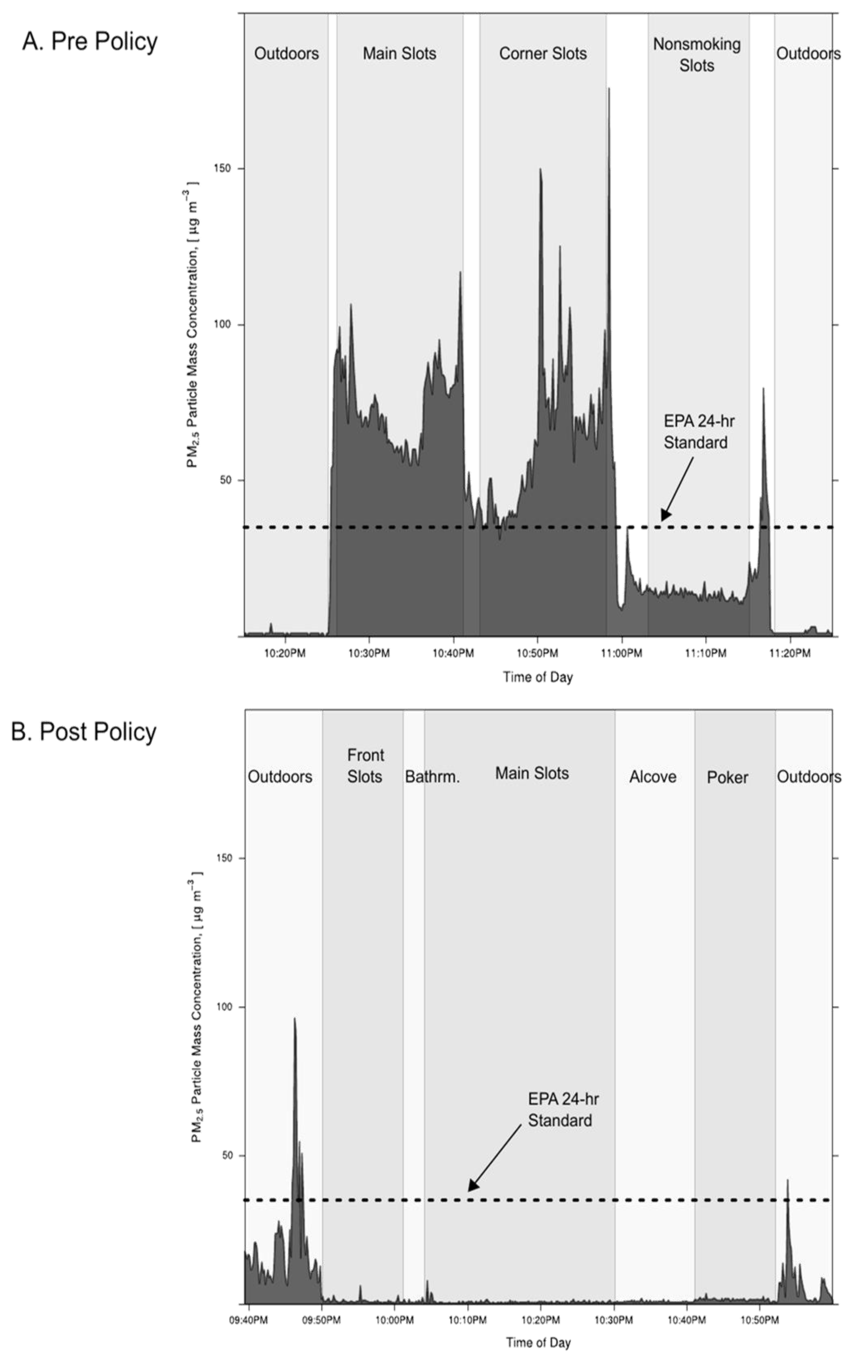 Plots illustrating the change in real-time 10-s fine particle (personal exposure) concentrations (PM2.5) from before to after the adoption of a 100% casino-wide, smoke-free policy as measured by CAC visitors acting as patrons (sitting at slot and table games). The reduction in indoor particle levels after the smoke-free policy went into effect is apparent, as well as the increase in outdoor levels: (A) a Friday night in 2011 before the casino-wide smoke-free policy was adopted; and (B) a Friday night in 2014 after the smoke-free policy was adopted. The U.S. EPA 24-h health-based-standard for fine particles of 35 µg/m3 is shown as a horizontal dotted line. Approximately 40–60 active smokers were observed inside the ~20,000 square-foot smoking-allowed (slots + tables) area of the casino during the monitoring period in 2011. No tobacco smokers were observed inside the casino during the 2014 monitoring period, although several active e-cigarettes were observed.