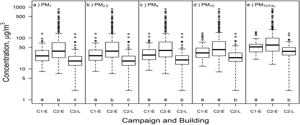 Airborne particulate mass concentration (µg/m3) in Campaign 1 Building E (C1-E; n = 55), Campaign 2 Building E (C2-E; n = 168), and Campaign 2 Building L (C2-L; n = 116) for (a) PM1; (b) PM2.5; (c) PM4; (d) PM10; and (e) PMTOTAL. Different letters within the same box represent statistically significant (p < 0.05) groups under the Kruskal-Wallis multiple comparisons test.