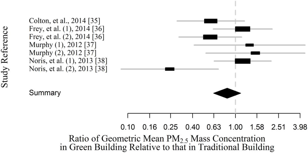 Although suggestive, data from the collected literature do not provide sufficient evidence to conclude that green residential buildings have lower PM2.5 than traditional residential buildings. This is an important result in the context of increased construction of green buildings based on energy and environmental constraints that often do not prioritize health components of buildings. However, the number of studies was small and future studies may find differences, especially because variability in PM2.5 mass concentration was high across and within buildings in each study. Not all differences may be related to building design. Since green buildings may be newer than traditional buildings and some green building occupants may have self-selection bias, occupants of green buildings may more carefully control their indoor air quality, or at least have higher awareness about air quality issues. Because we compared ratios of PM2.5 calculated separately for each study, the variety of methods to measure PM2.5 (e.g., gravimetric, photometers) in different studies should not have affected our results.